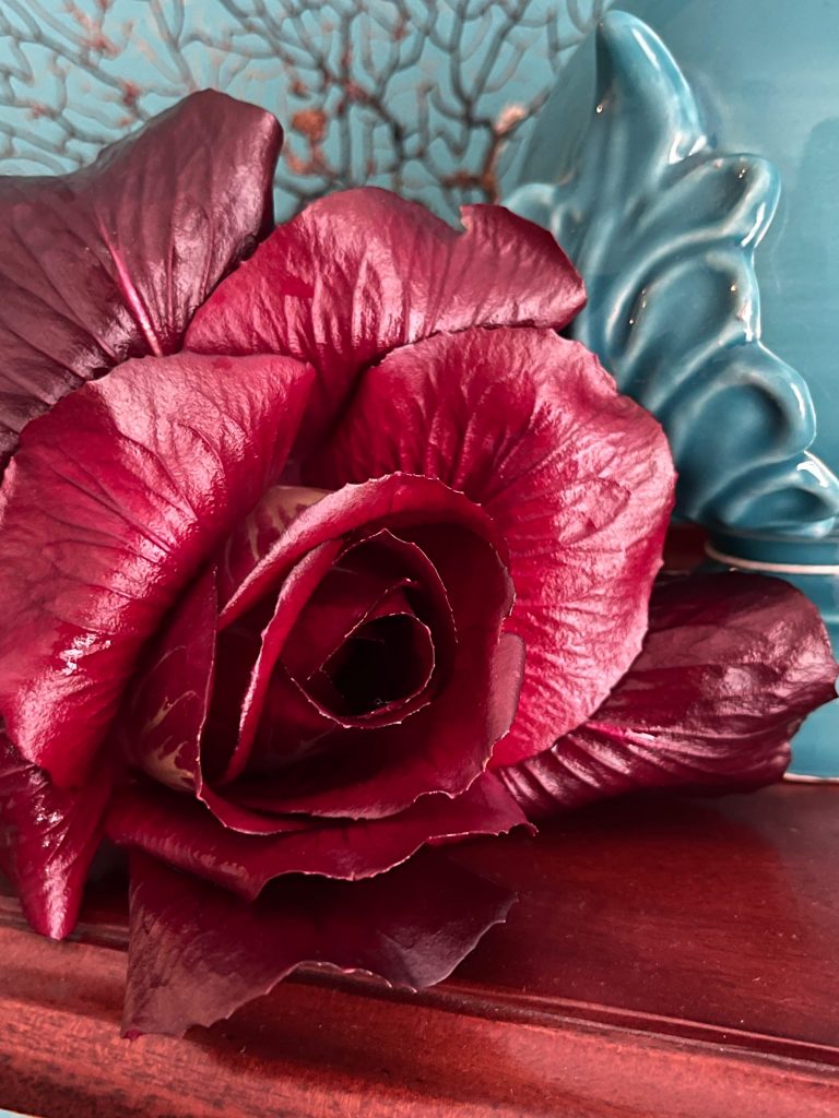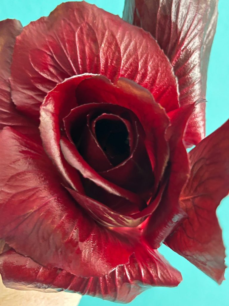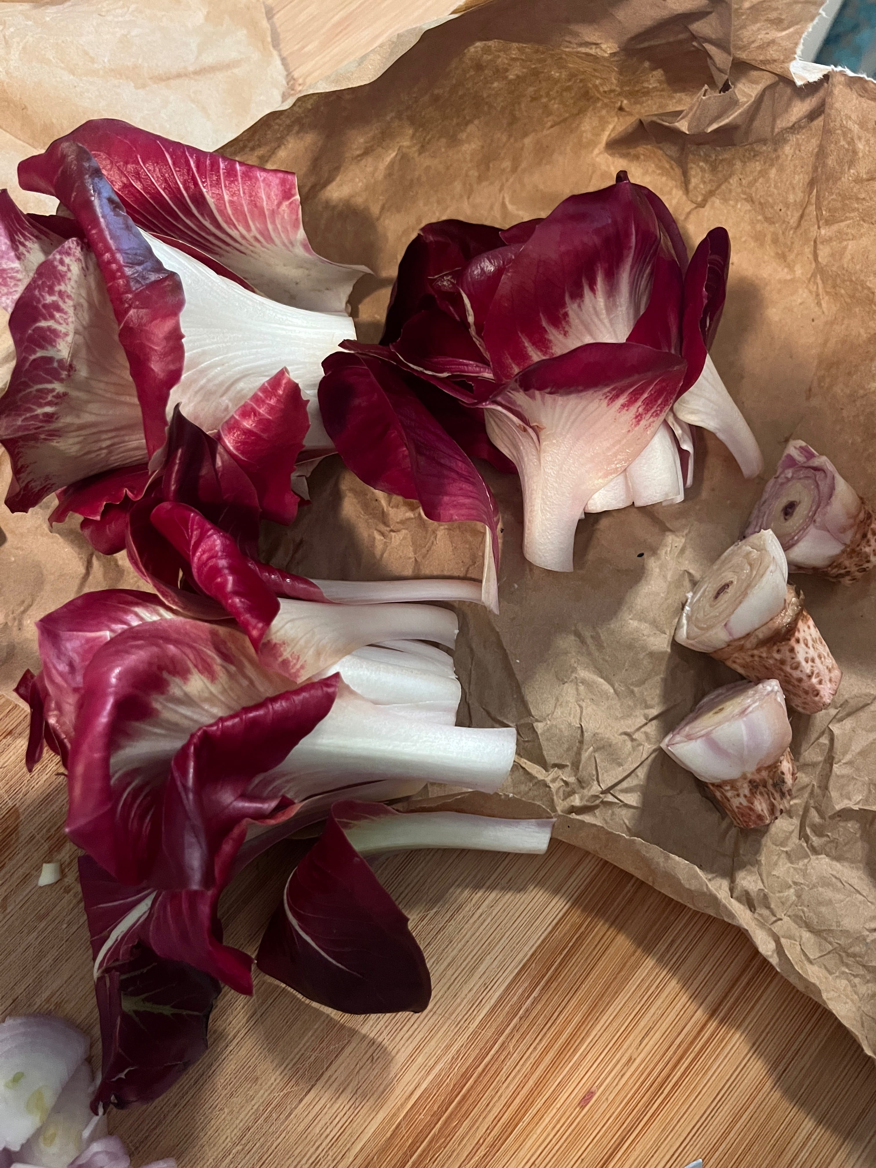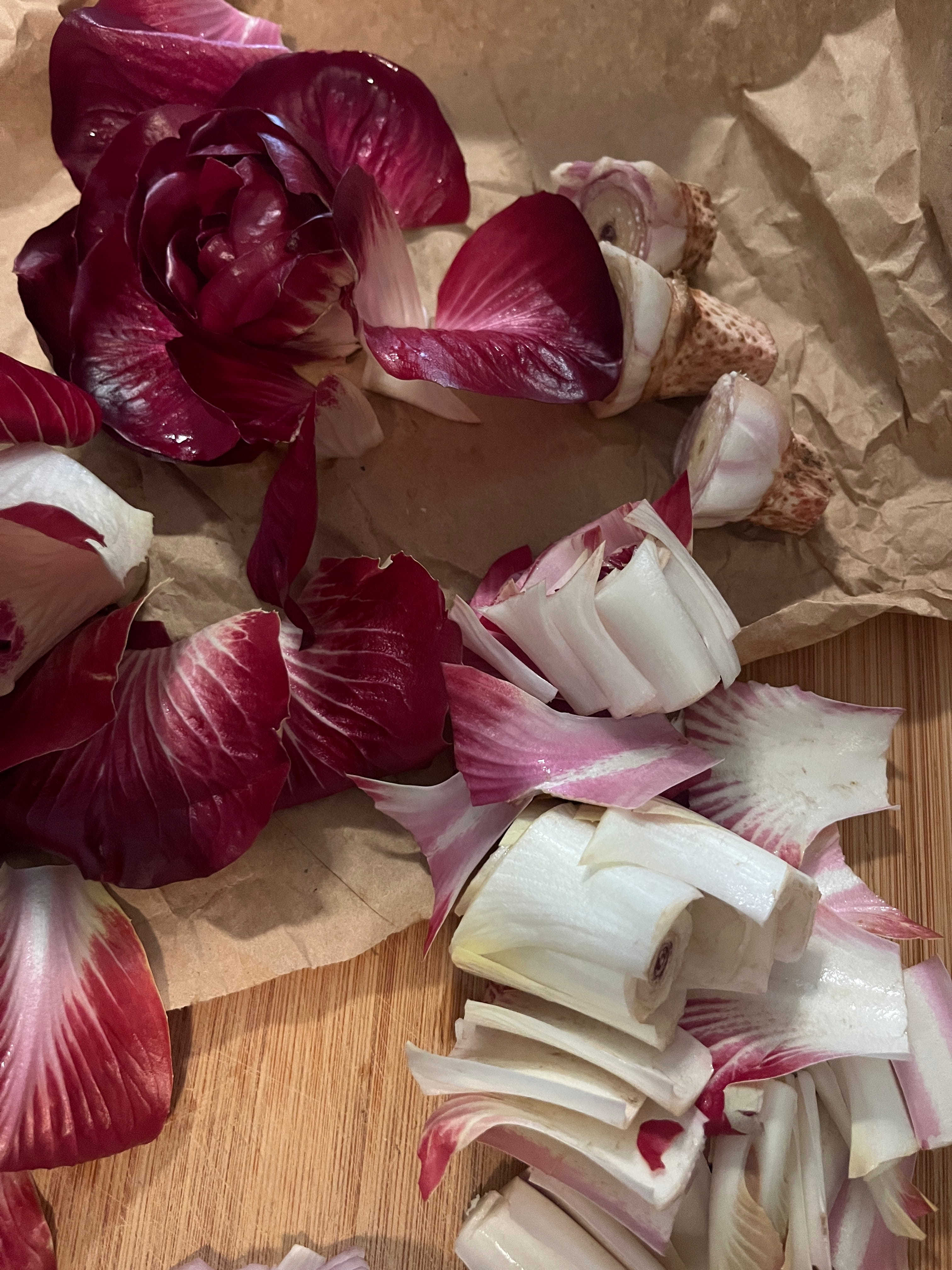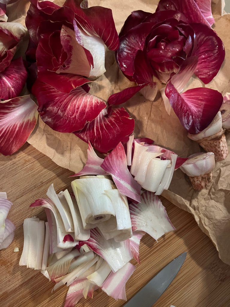 Die Radicchiorosen mit kalten Wasser kurz abspülen; den kurzen Strunk abschneiden; die kurzen, weißen Stiele abschneiden und diese etwas zerkleinern. Die dunkelroten Teile der Rose zur Seite legen.