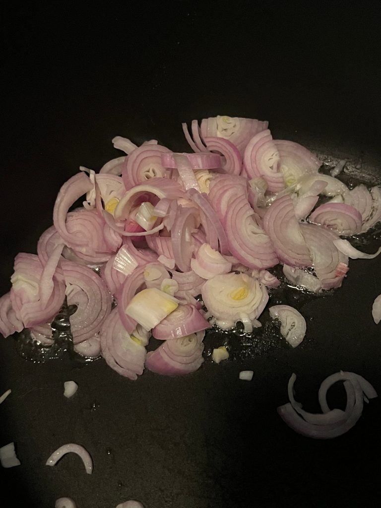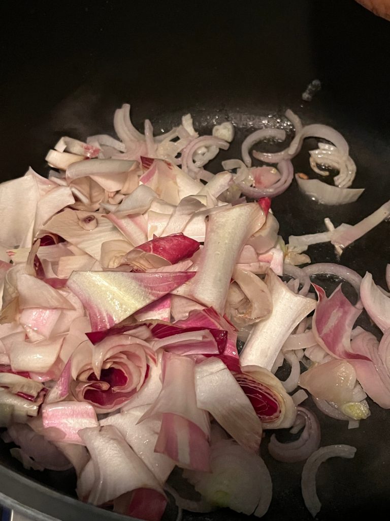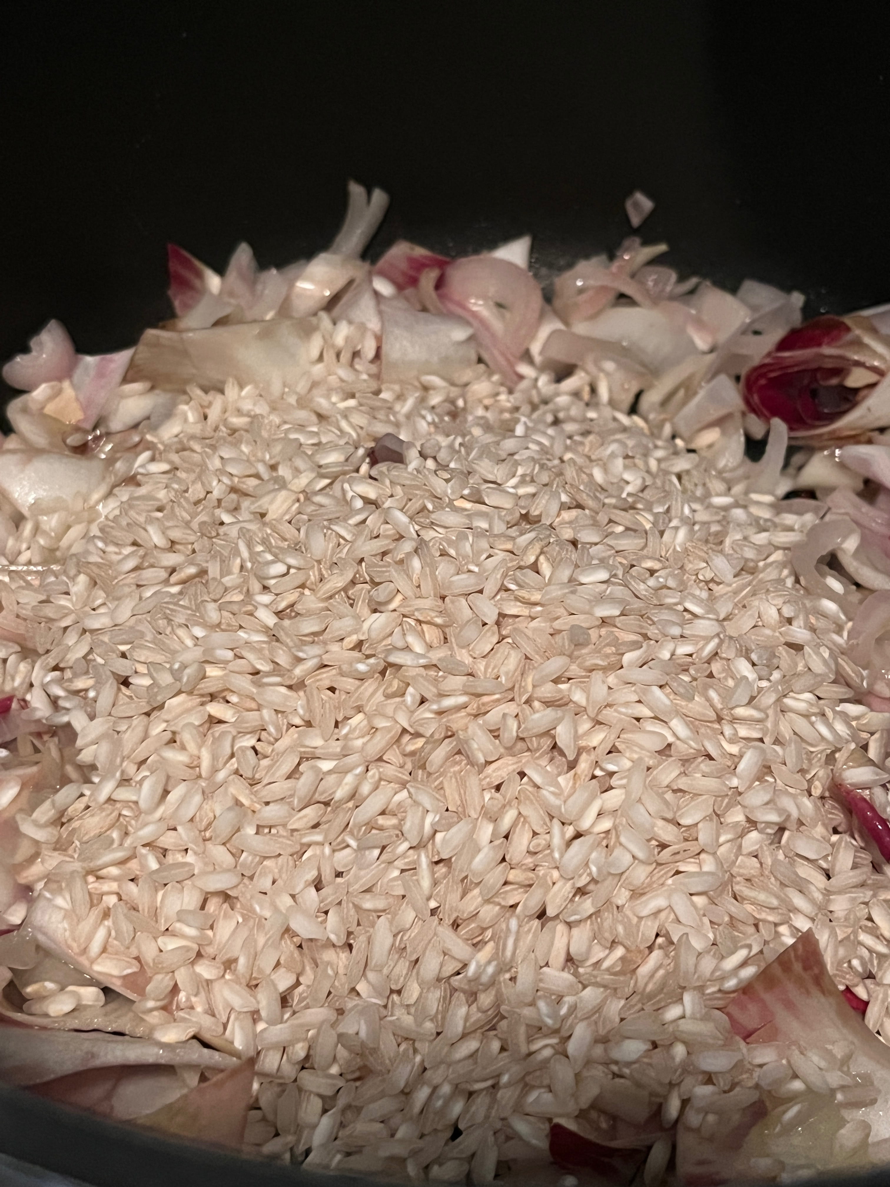 In einem Topf etwas Butter zerlassen, die Schalottenstücke darin anschwitzen, die zerkleinerten Stiele der Radicchiorose dazugeben und den Reis unterrühren. Mit dem Noilly Prat ablöschen und kurz einziehen lassen.