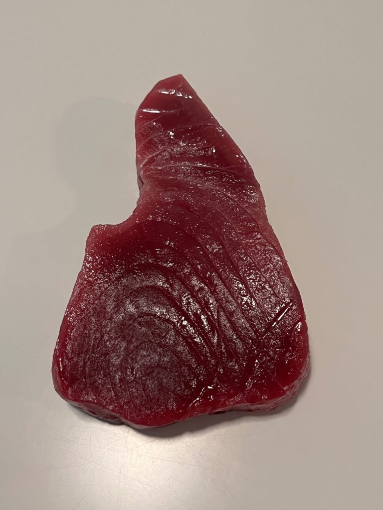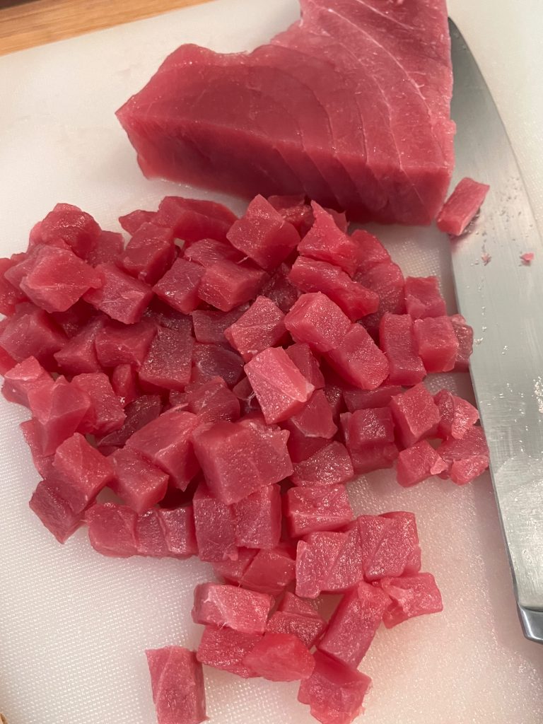 In der Zwischenzeit das Thunfischfilet kleinwürfelig schneiden.