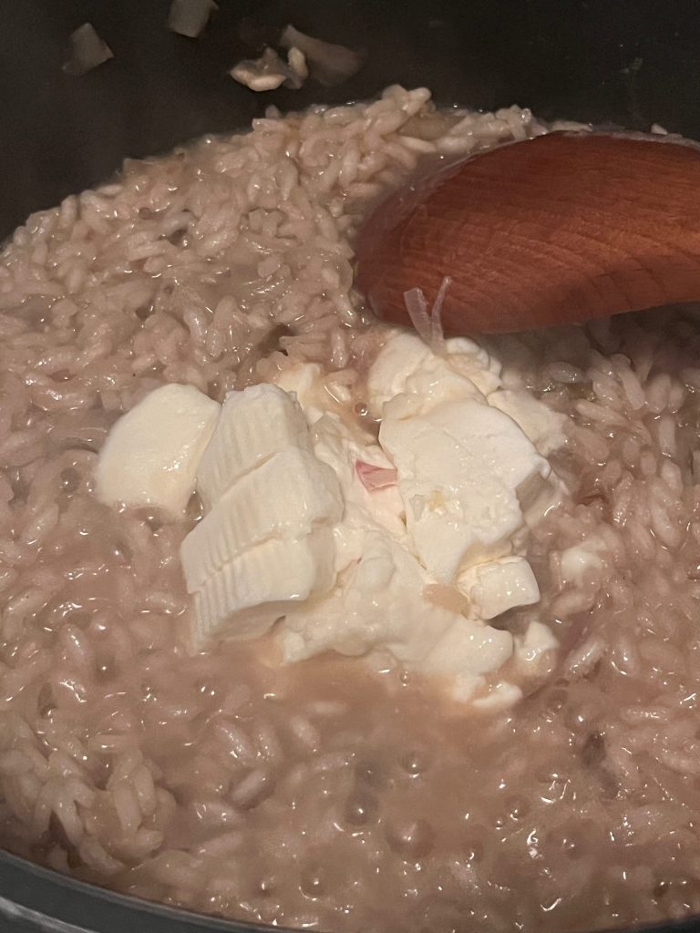 Den zerkleinerten Stracchino (er ist cremig, weich) und etwas Butter und den Parmesan einrühren. Fin fine soll die Konsistenz des Risottos eine cremige sein …. also eventuell noch etwas Suppe oder Wasser dazugeben.