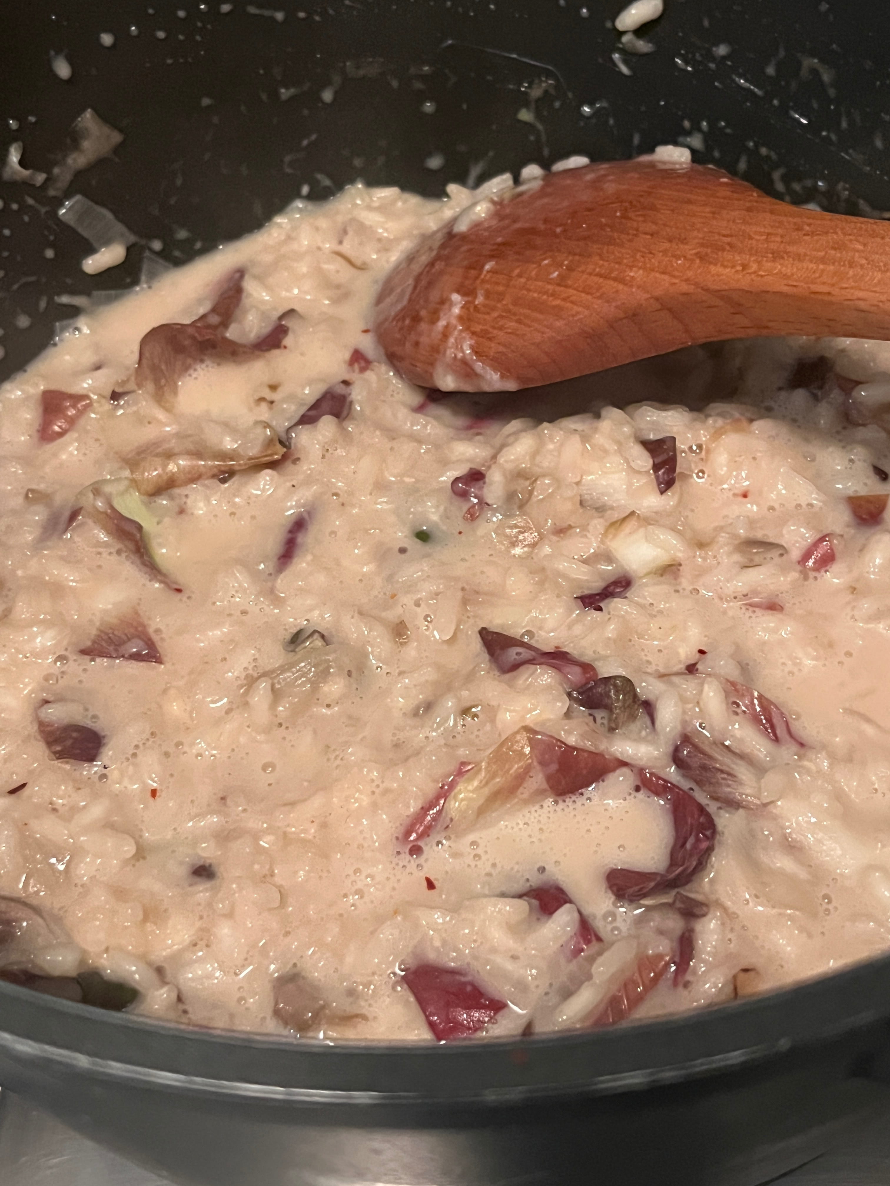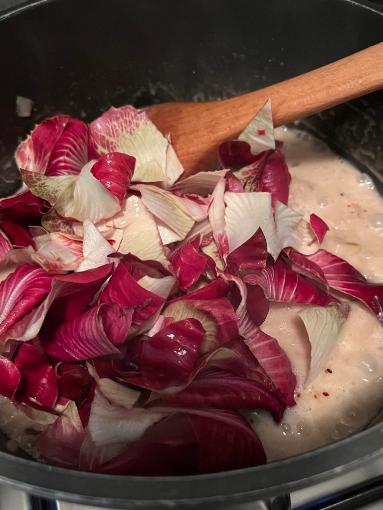 Von den Radicchioblättern nun die weniger schönen hernehmen, zerkleinern und roh in das Risotto rühren. Mit Salz abschmecken.