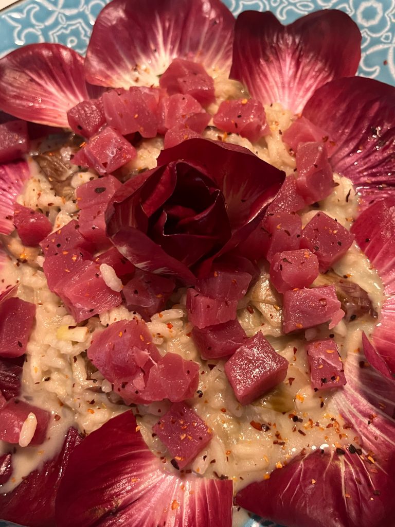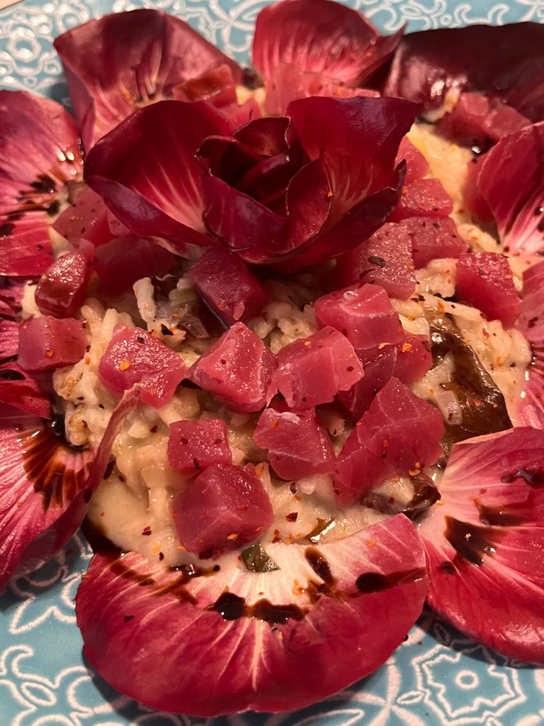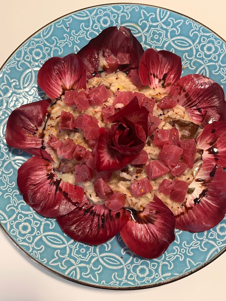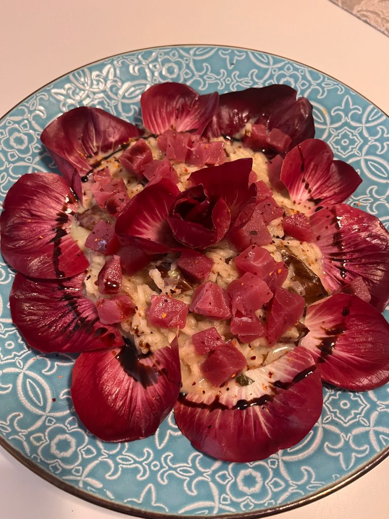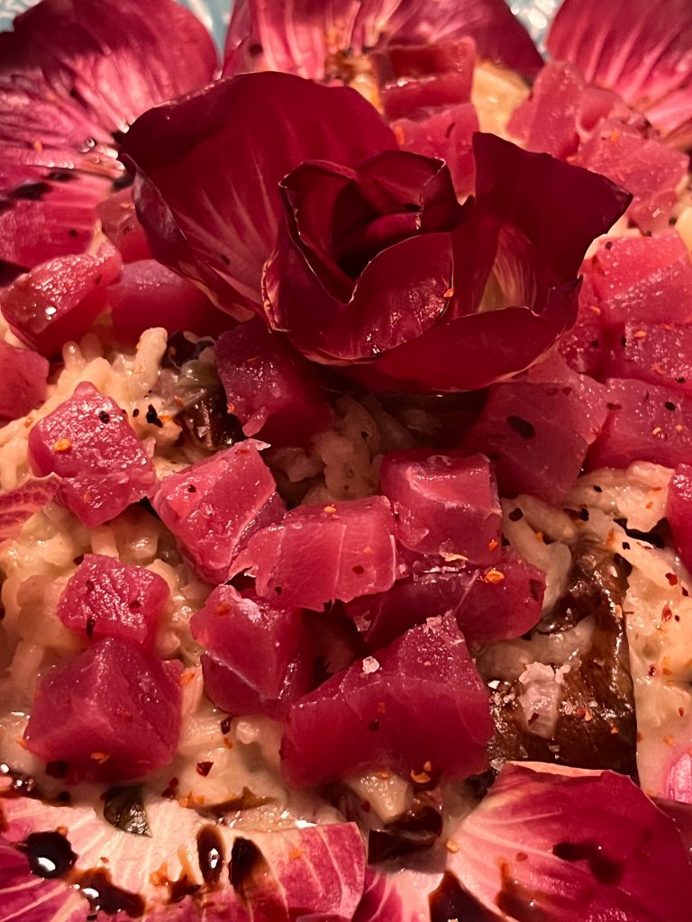 Nun die Teller mit einigen Blättern auslegen, das Risotto darin anbringen, die Rose daraufsetzen, die Thunfischwürfel darauf verteilen. Mit Chilisalz bestreuen und mit einem hochwertigen Balsamico beträufeln!