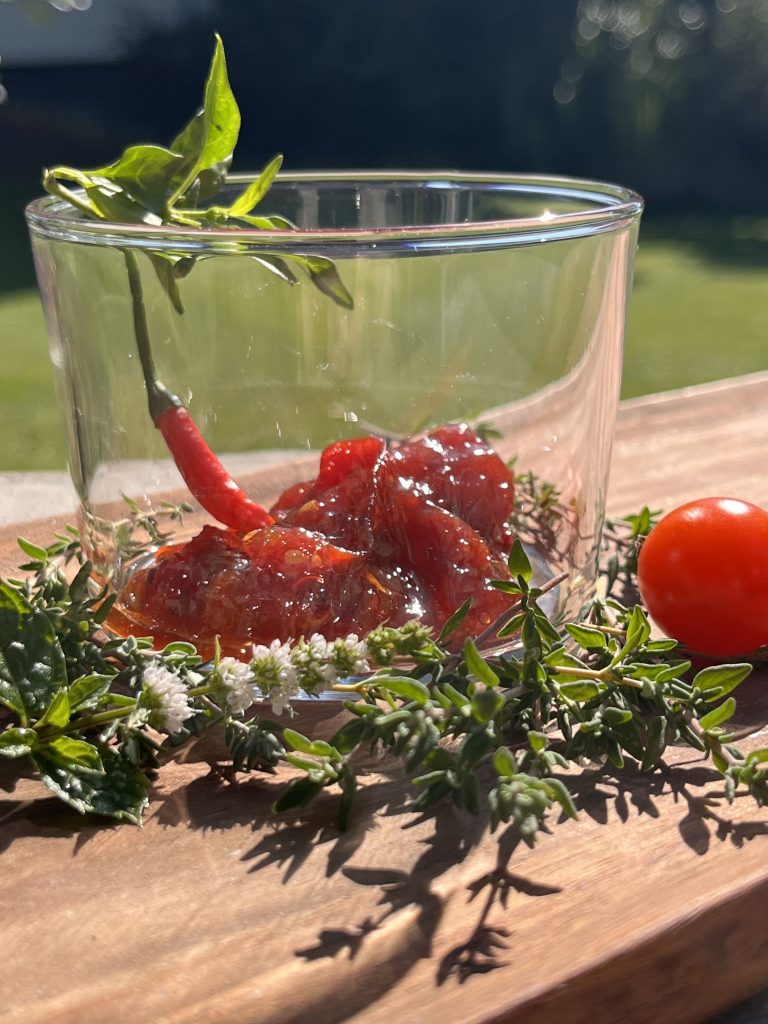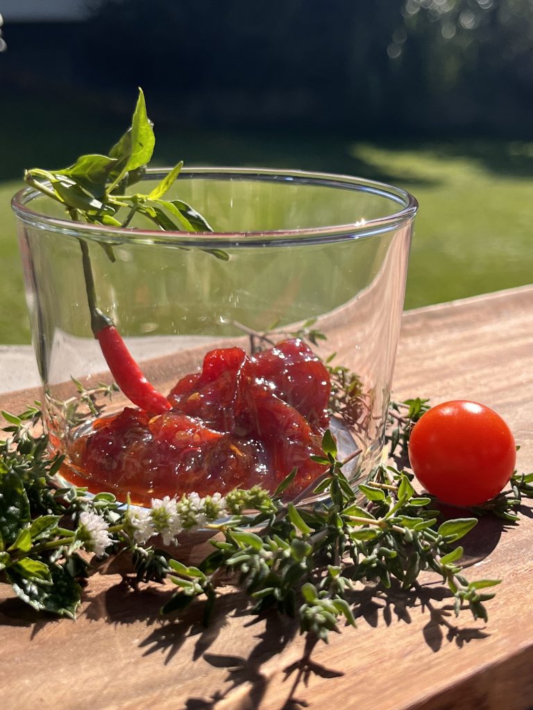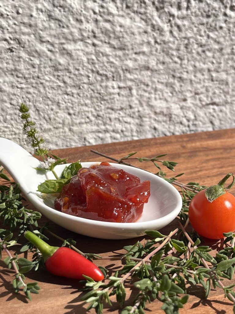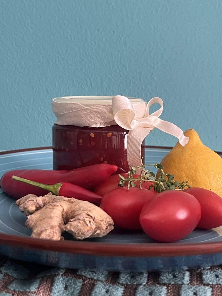 Die Marmelade ist durch Zugabe von Chili, Ingwer und Zitrone würzig, ohne dass der Geschmack der Tomate verschwindet.
