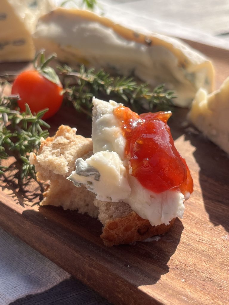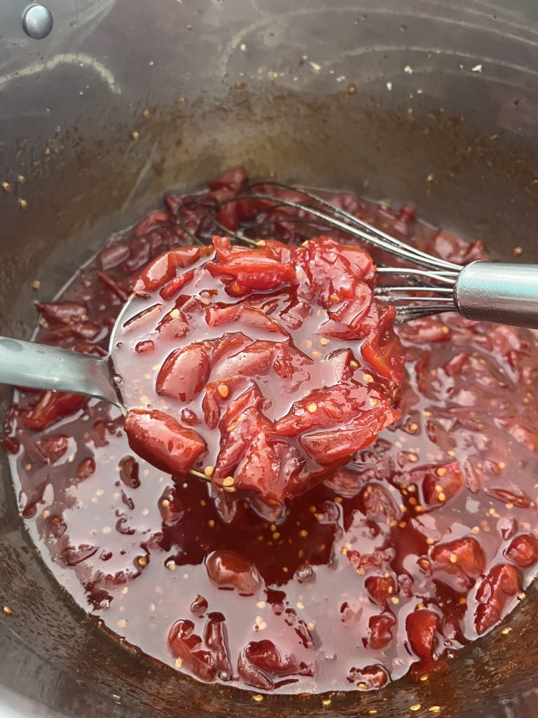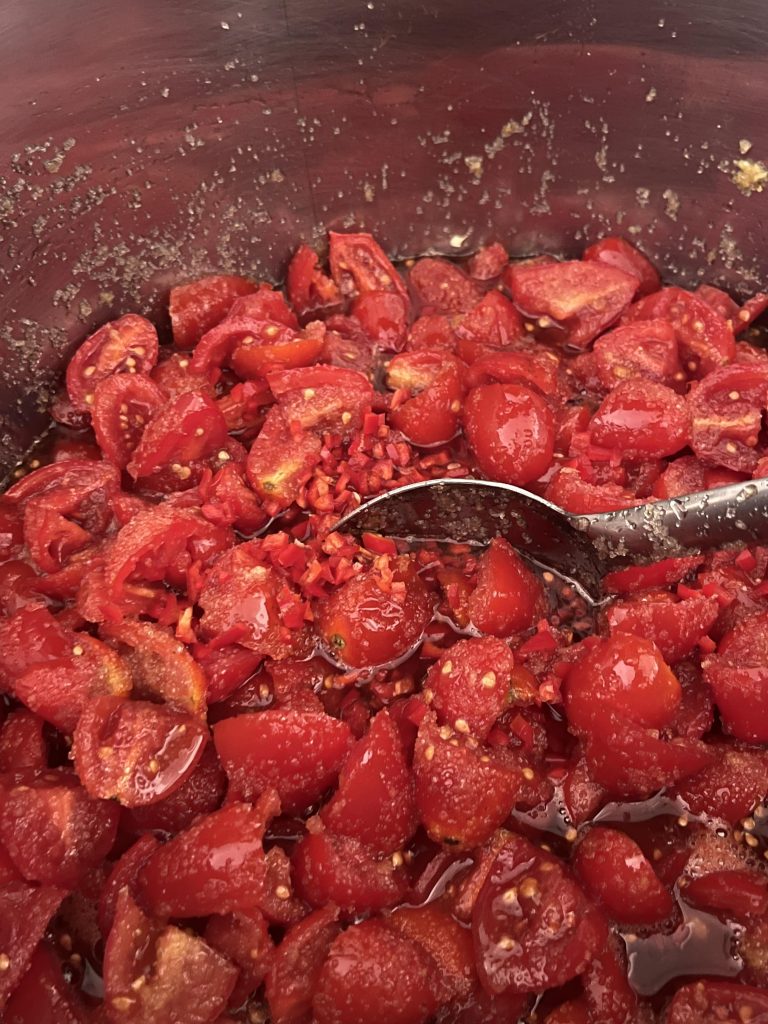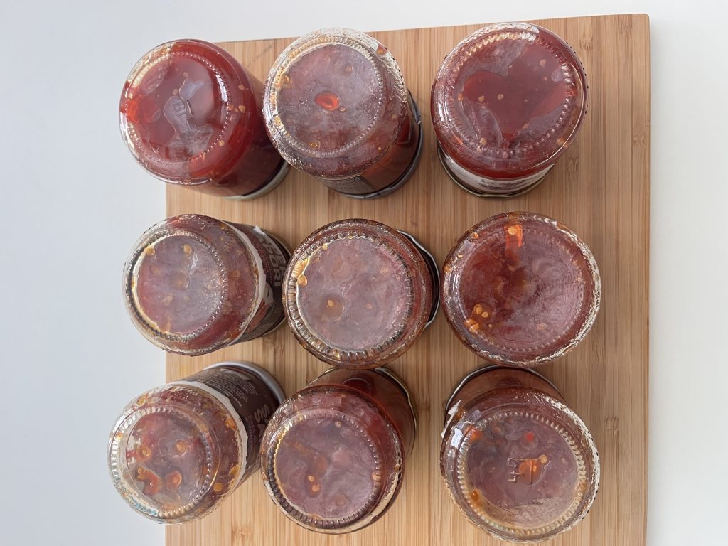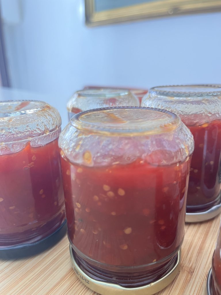 Die Marmelade ist durch Zugabe von Chili, Ingwer und Zitrone würzig, ohne dass der Geschmack der Tomate verschwindet.