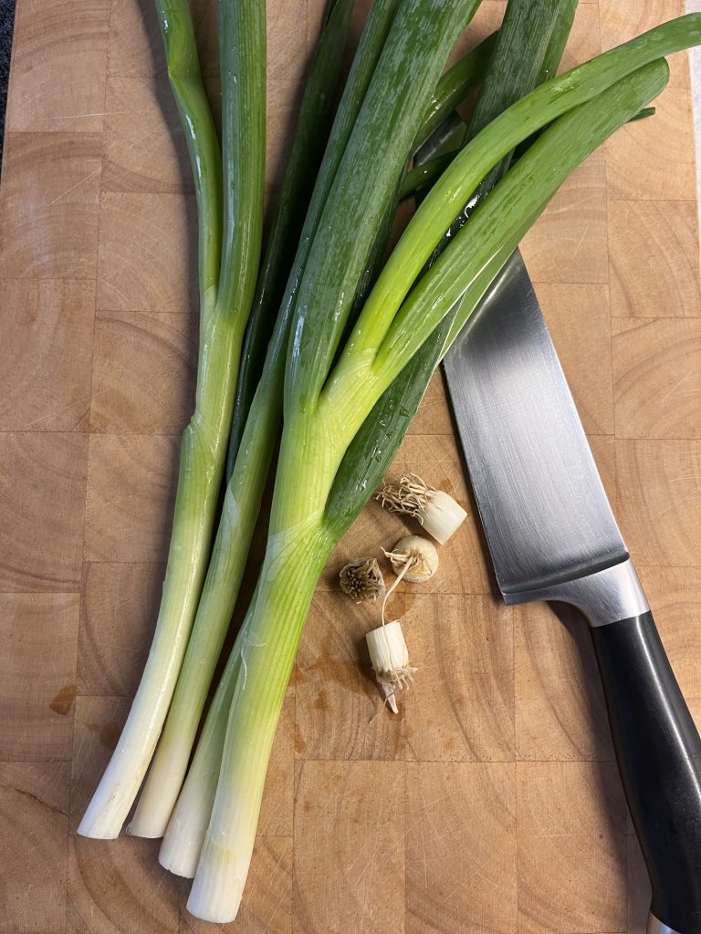 Von den Frühlingszwiebeln die Wurzeln abschneiden und am anderen Ende den oberen Teil kappen, damit nur wirklich die schönen Stängel übrig bleiben. Waschen und in kleine Ringe schneiden.