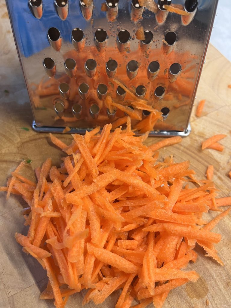 Die Karotte auch waschen, zuputzen und grob hacheln.