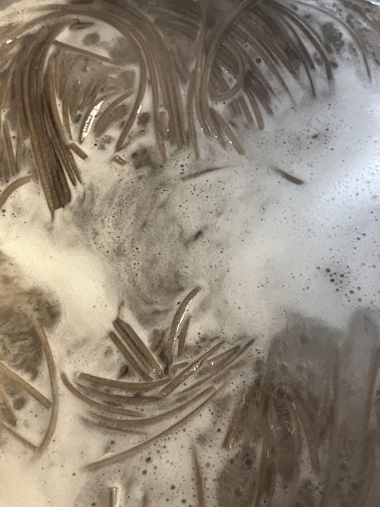 Die Nudeln in kochendem Wasser einige Minuten kochen lassen; 1 Schöpfer kochendes Wasser auf die Zutaten in der Pfanne leeren und mit einem Kochlöffel vermischen. Nun mit einer Zange die Nudeln aus dem Wasser heben und tropfnass in die Pfanne geben. Alles gut vermischen und bei Bedarf noch Wasser dazugeben.