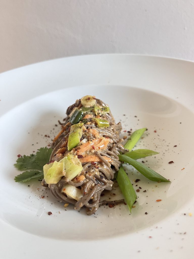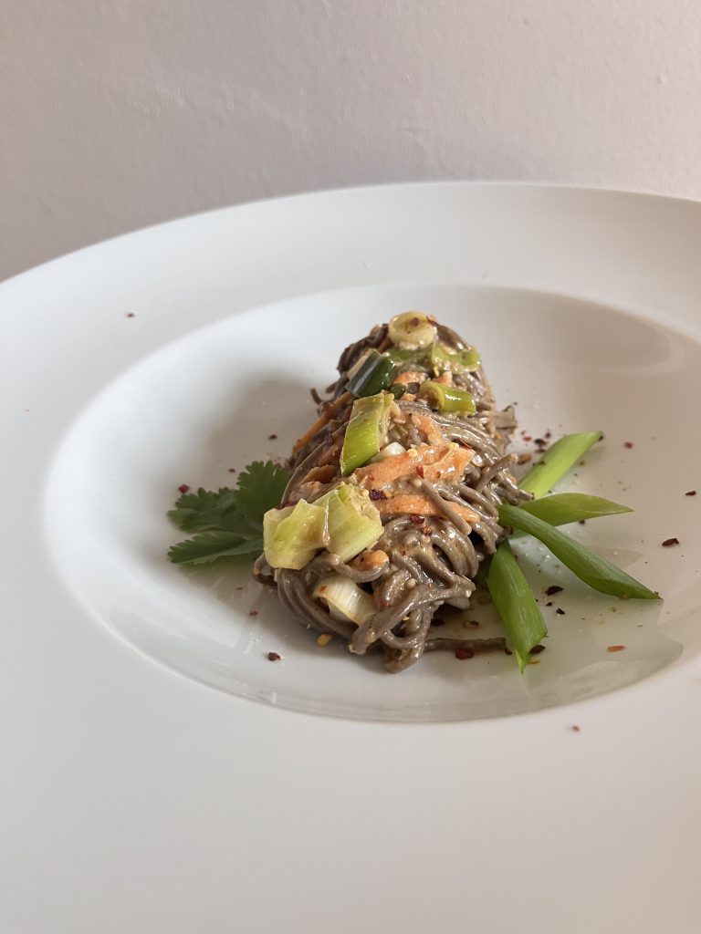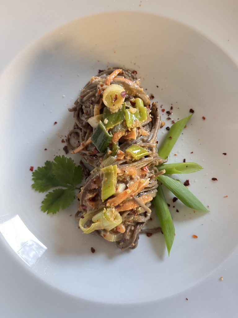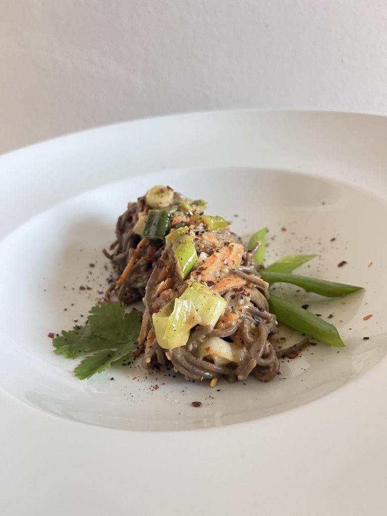 Mit einer dünnen, langen, schmalen Zange die Nudeln portionsweise aufwickeln und auf Teller anrichten. Mit der Sauce und dem Gemüse aus der Pfanne belegen; mit Chiliflocken und Timutpfeffer bestreuen; mit Koriander und Frühlingszwiebel dekorieren und servieren!