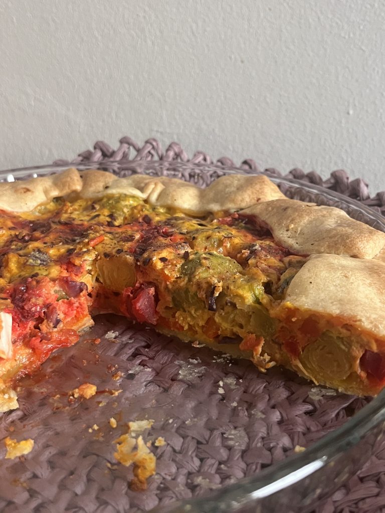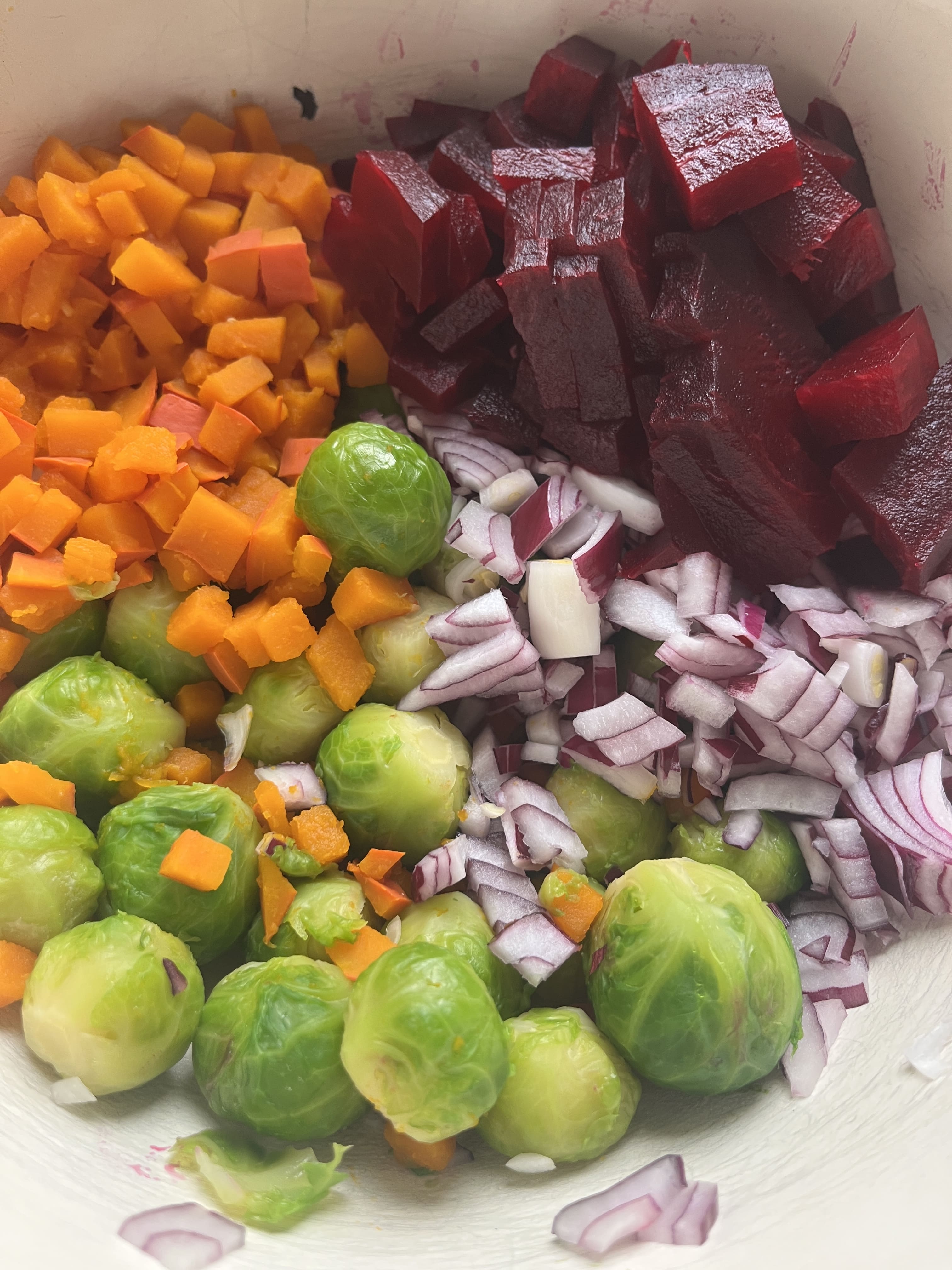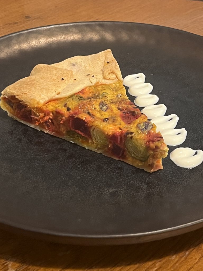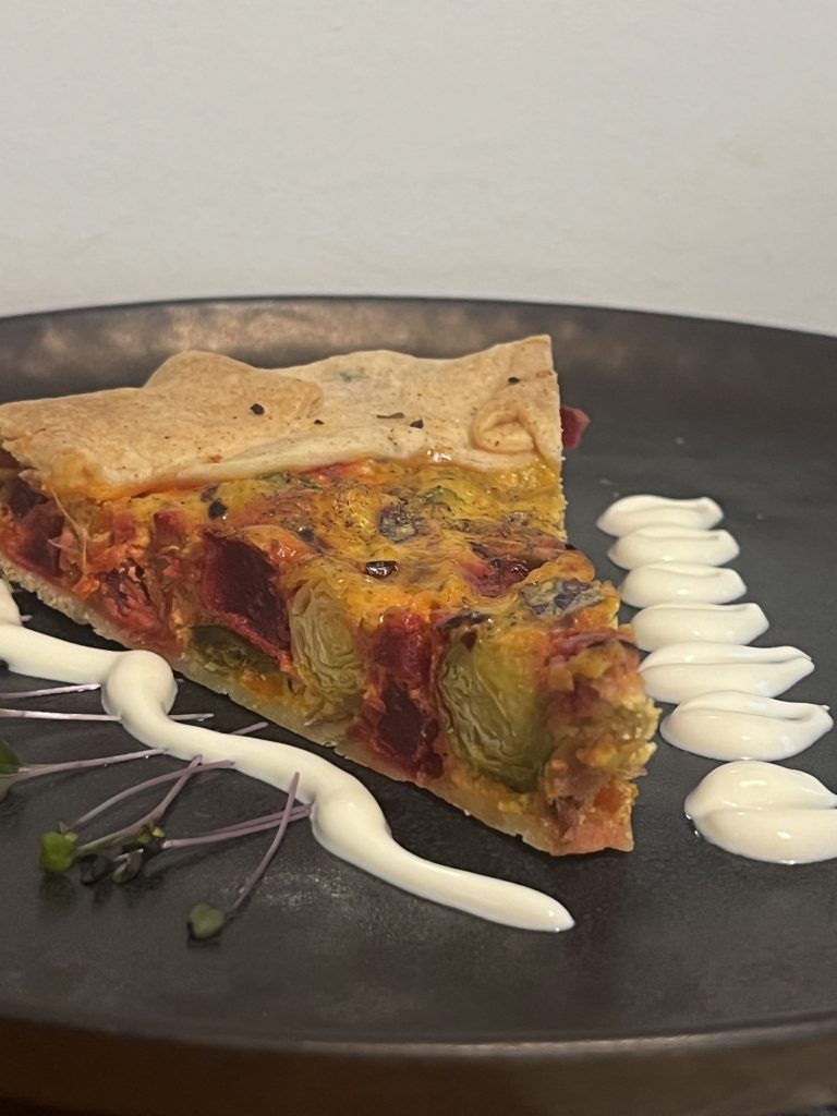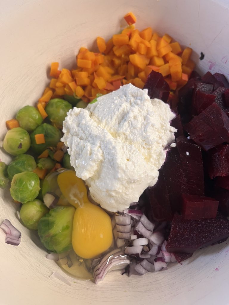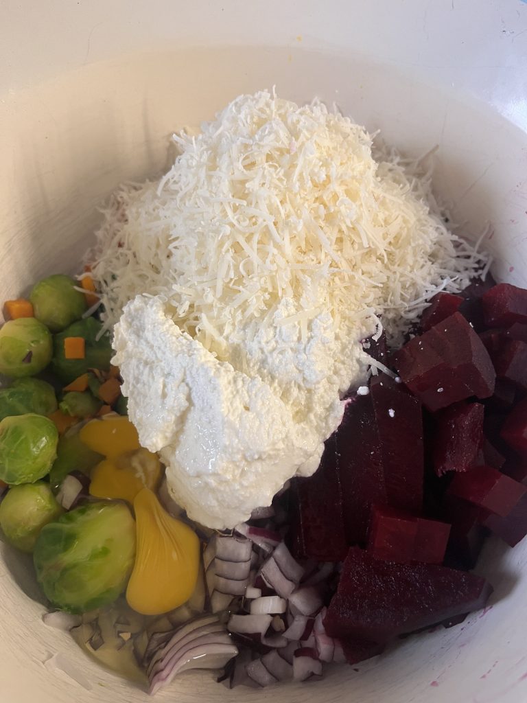 In einer Schüssel Kohlsprossen, Kürbis, Rote Rüben, Ricotta, Grana, Zwiebel, Knoblauch und das Ei gut vermischen; abschmecken und dann auf dem Teigboden verteilen!