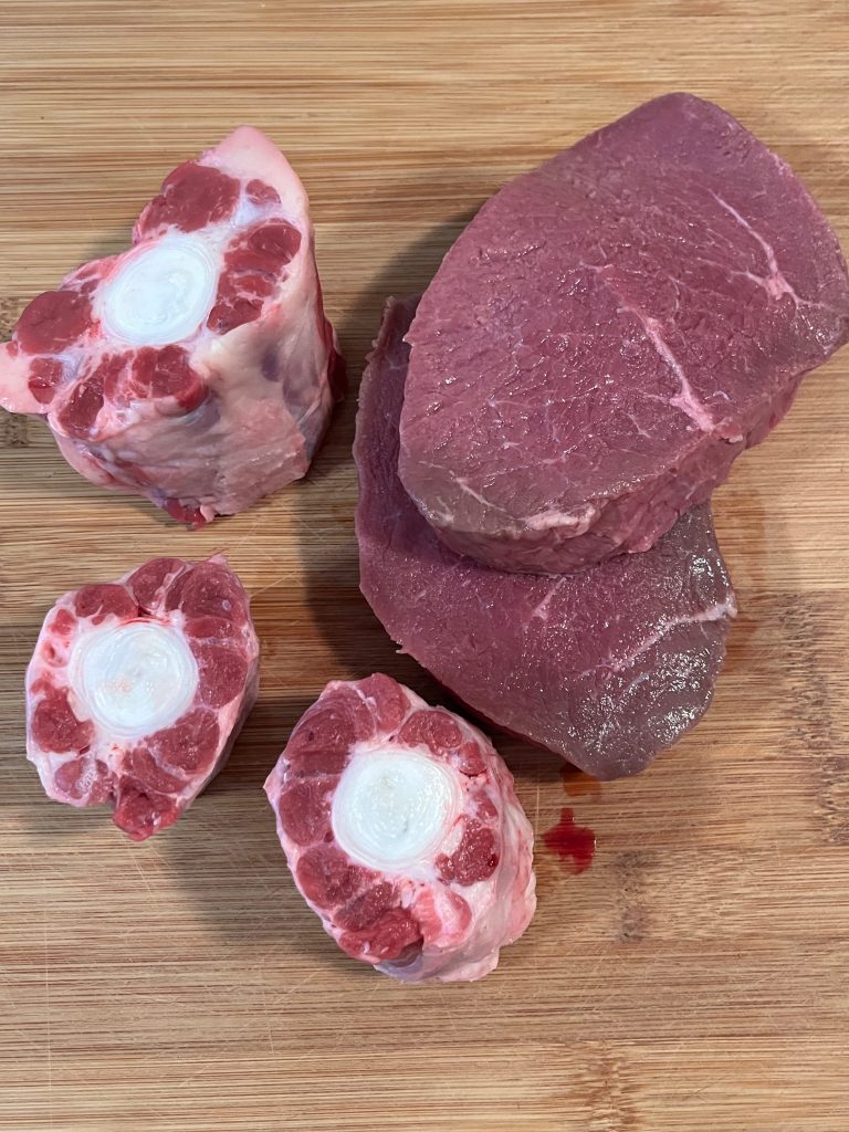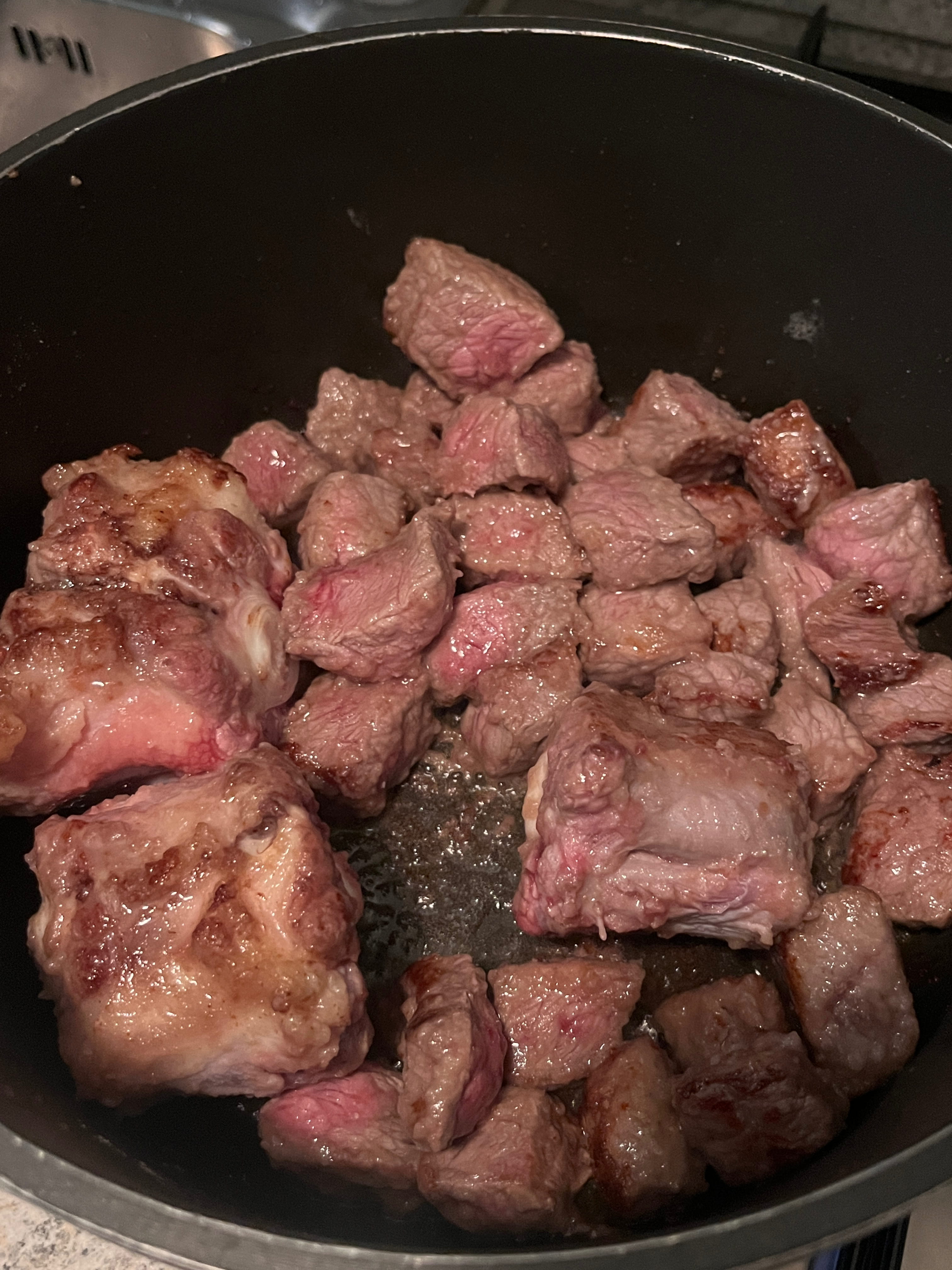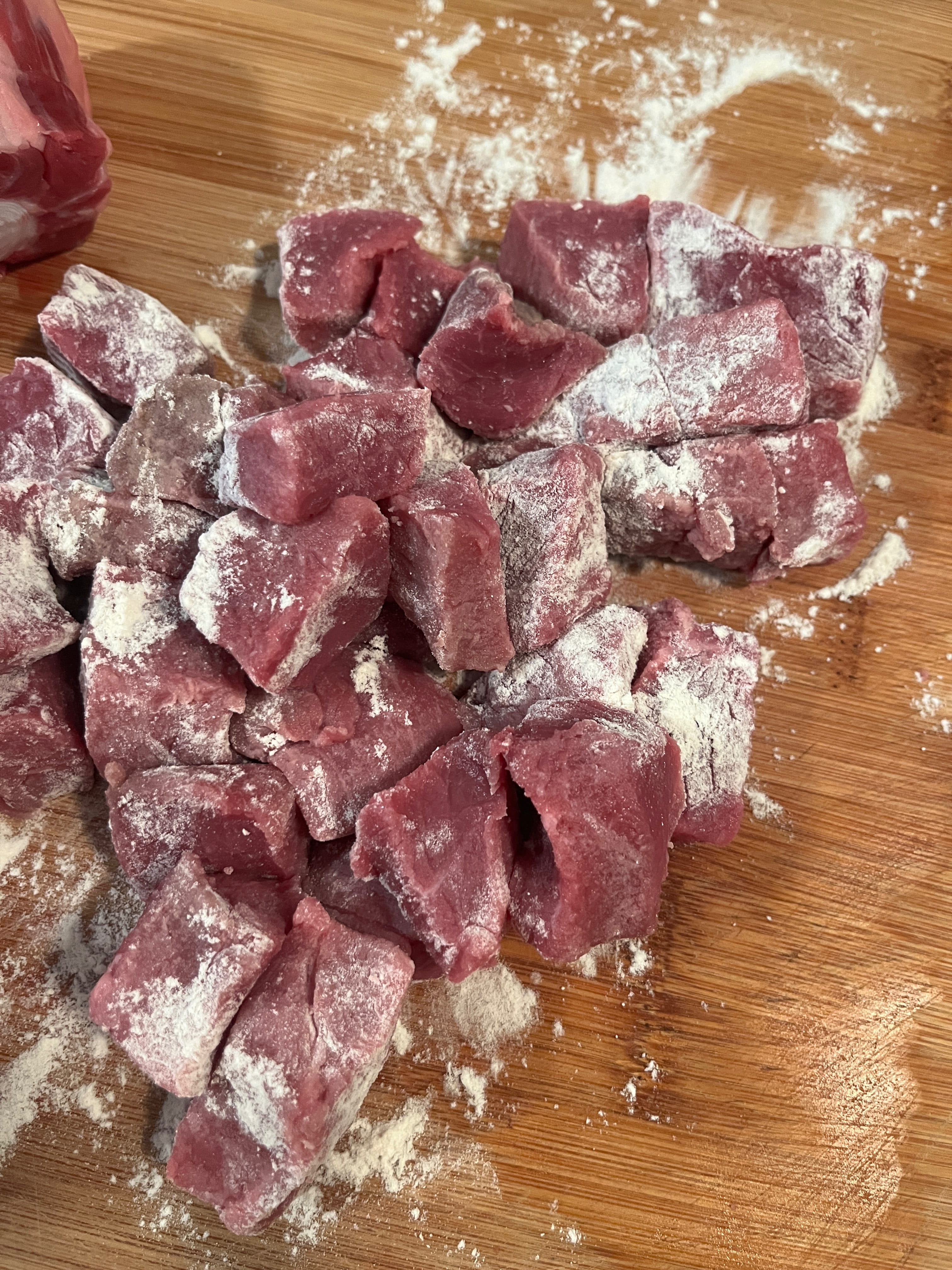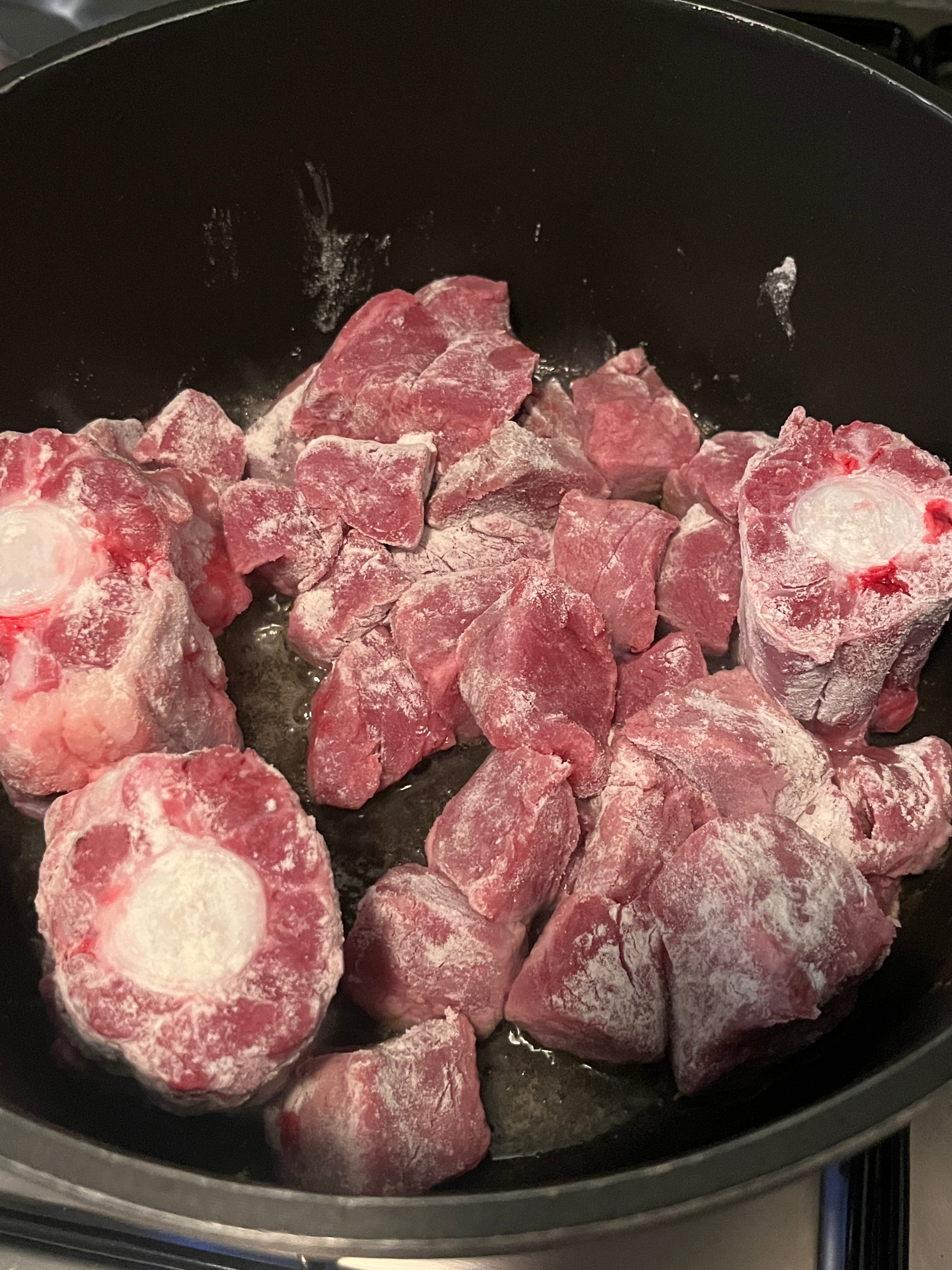 Das Fleisch würfelig schneiden. Fleischwürfel und Knochen in Mehl wenden.