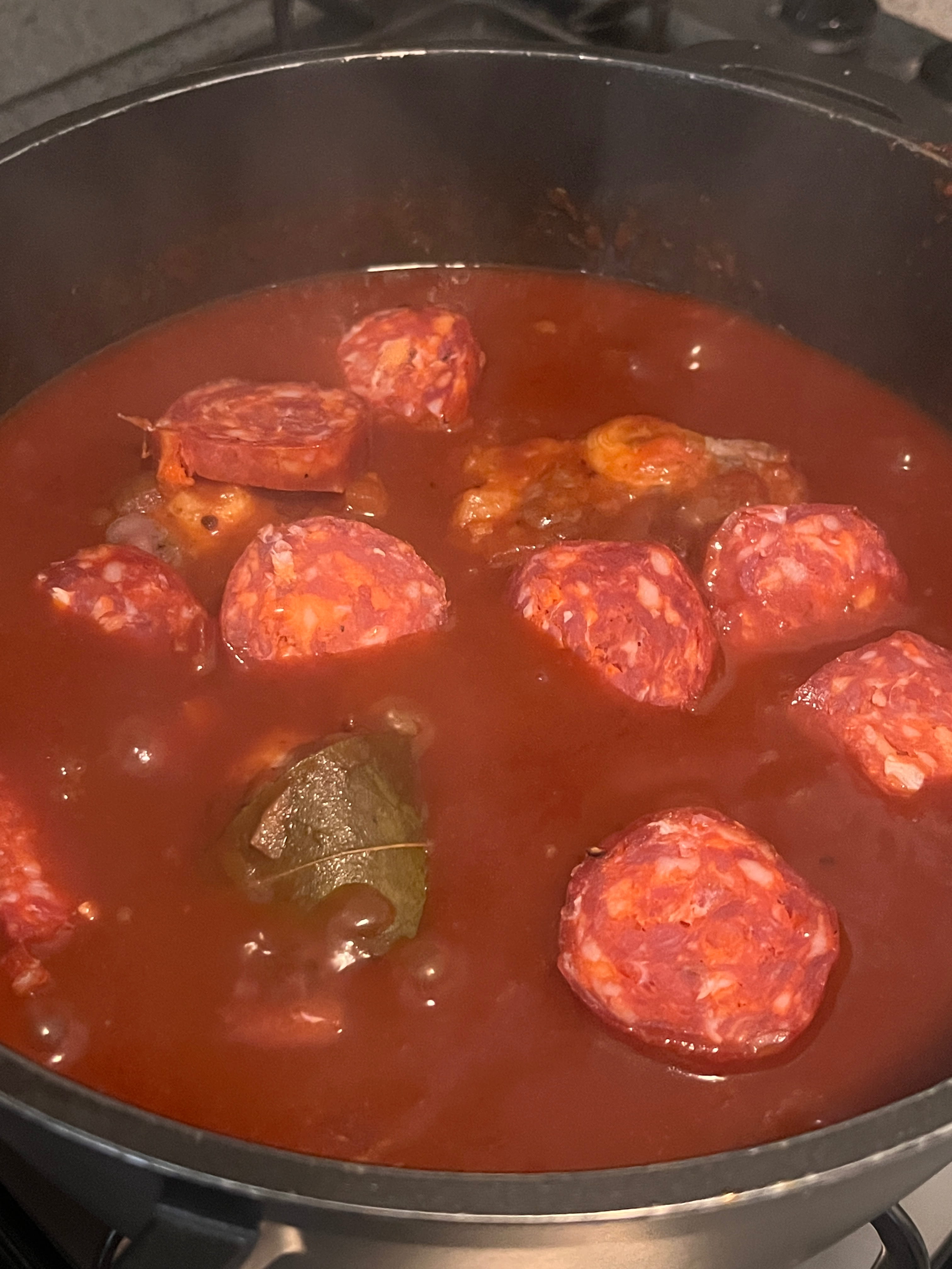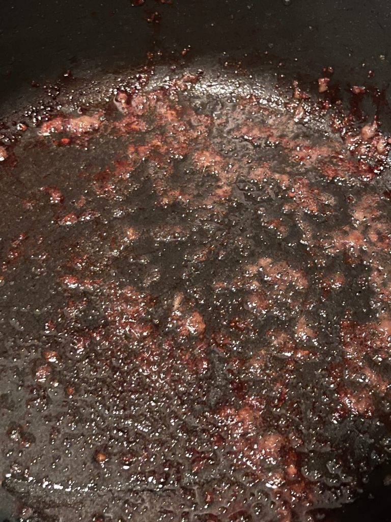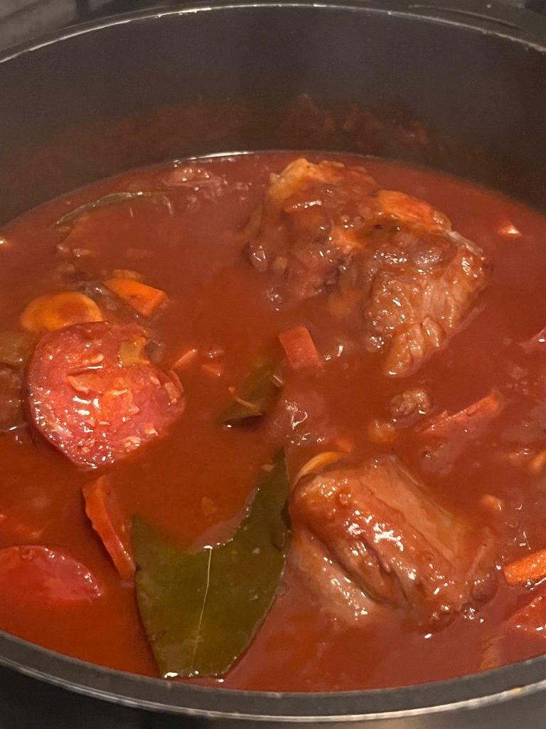 Immer wieder einmal umrühren, etwas Wasser angießen, etwas Wein angießen…..für ca. 2-3 Stunden!