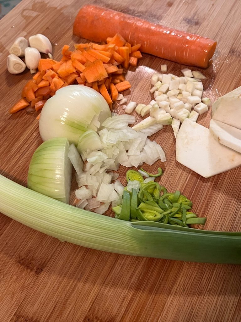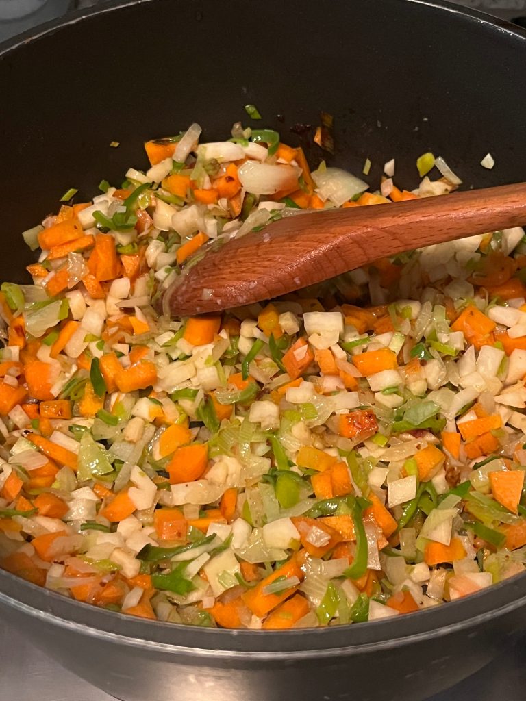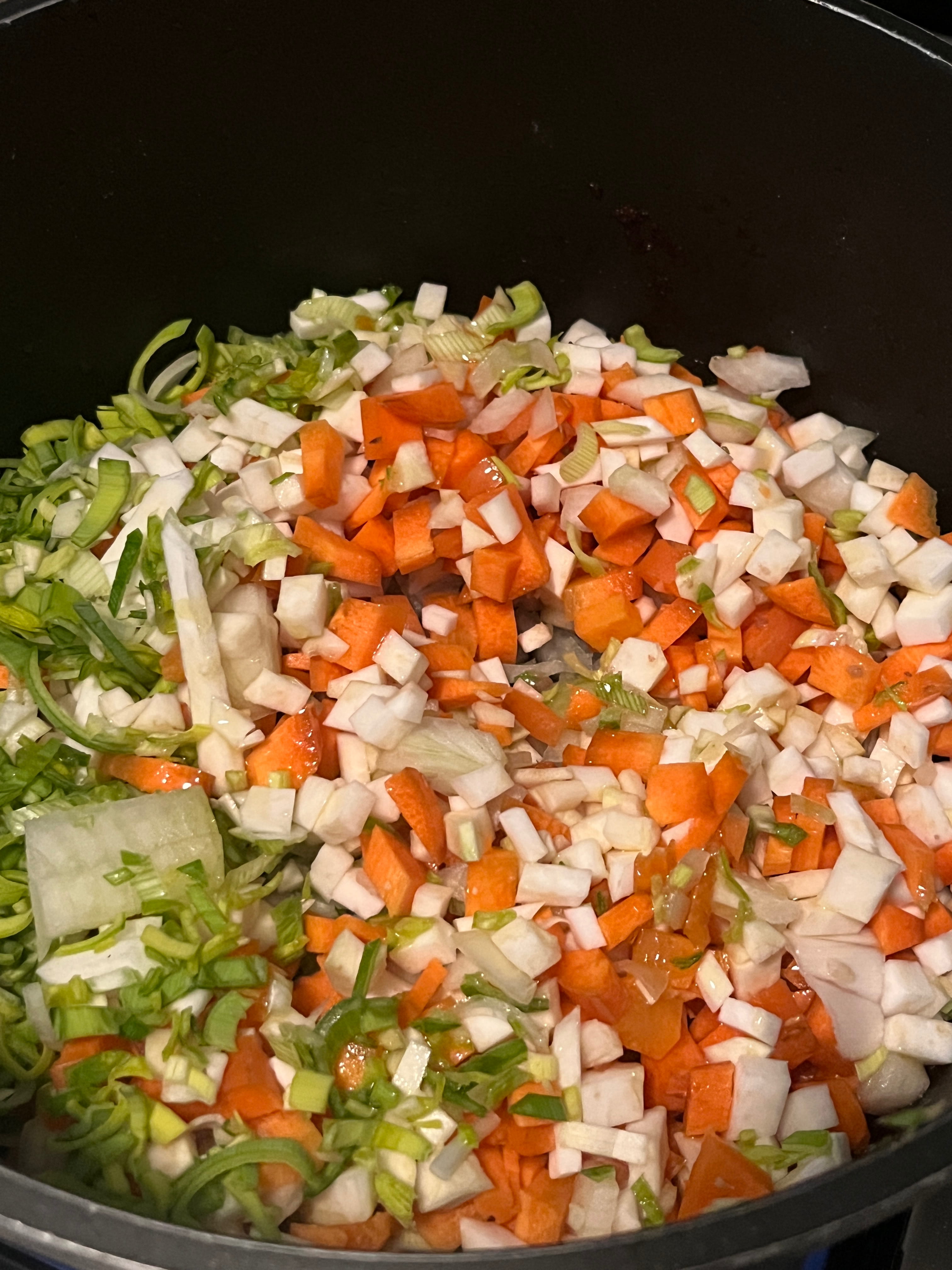 Das Gemüse schälen, sehr kleinwürfelig schneiden und dann in dem selben Topf anbraten; noch etwas Butter dazugeben.