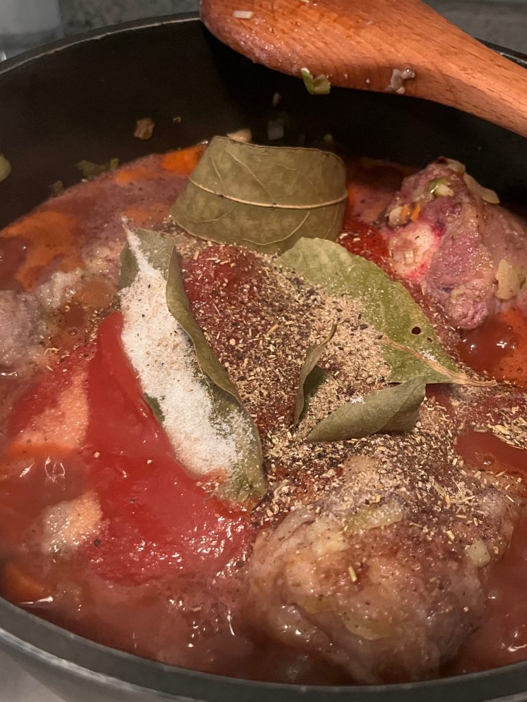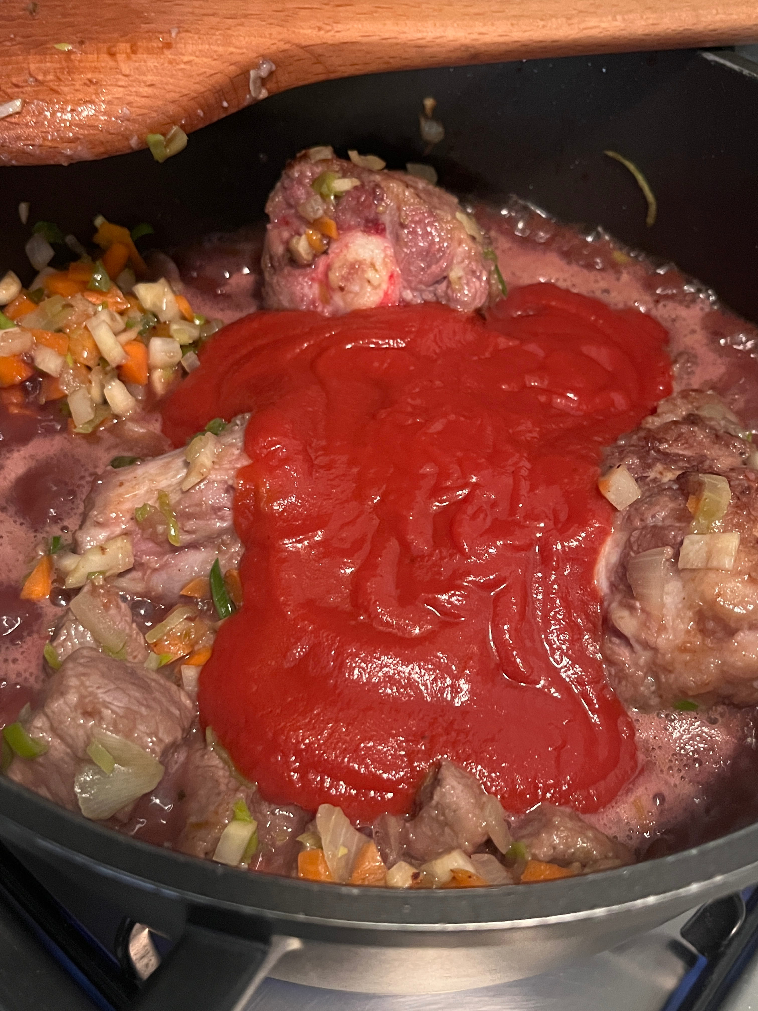 Wenn das Gemüse seidig glänzt, das Fleisch und die Knochen wieder dazugeben. 400ml Wein angießen, Gewürze, Tomatensauce und die in Scheibchen geschnittene scharfe Salami beifügen, alles gut vermischen und mit geschlossenem Deckel auf kleiner Stufe schmoren lassen.