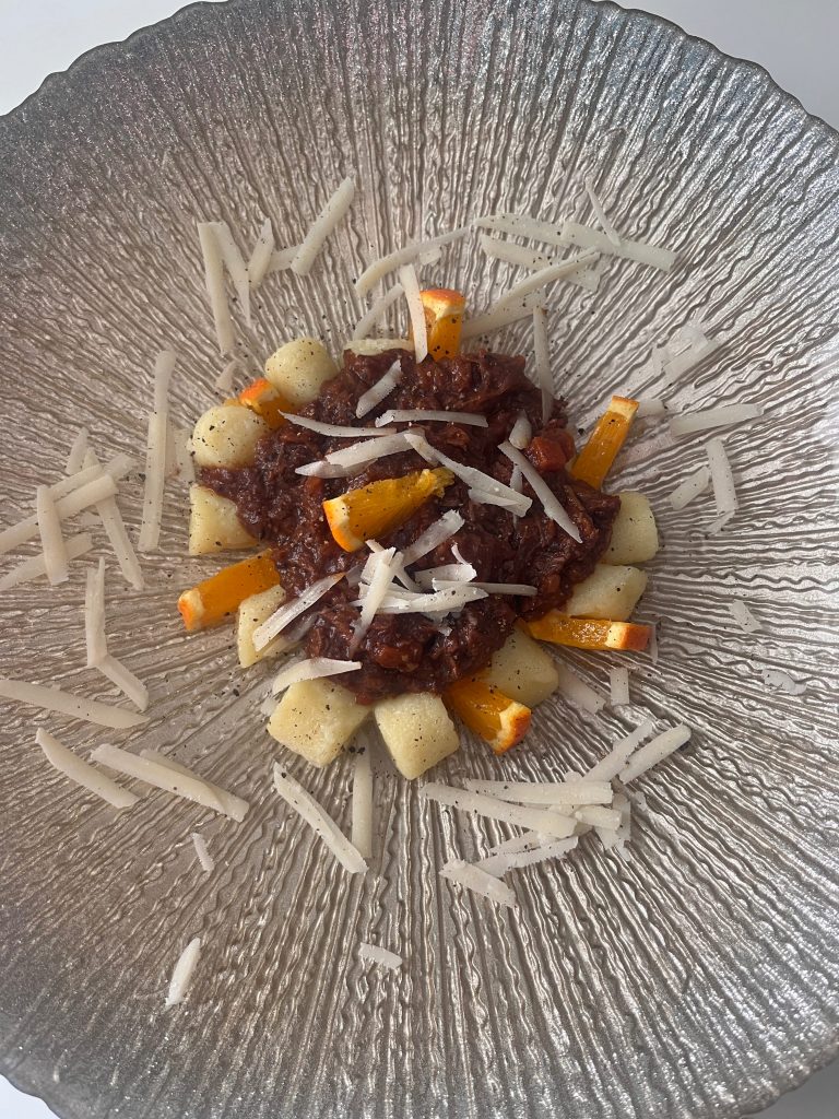 Die Gnocchi kochen, abseihen; eventuell etwas Kochwasser in die Fleischsauce gießen um eine optimale Konsistenz zu erlangen und mit Orangensaft und Zesten abschmecken!