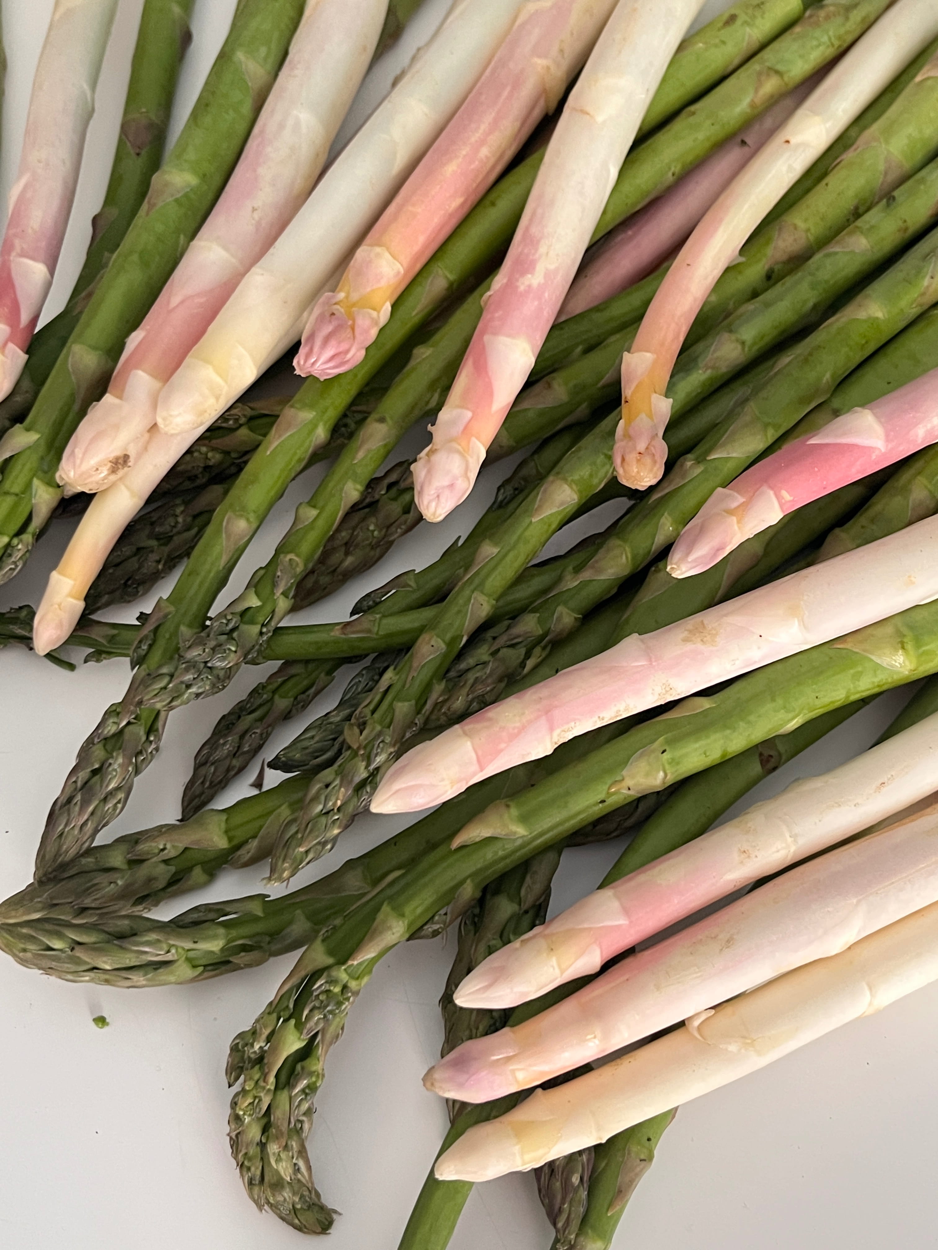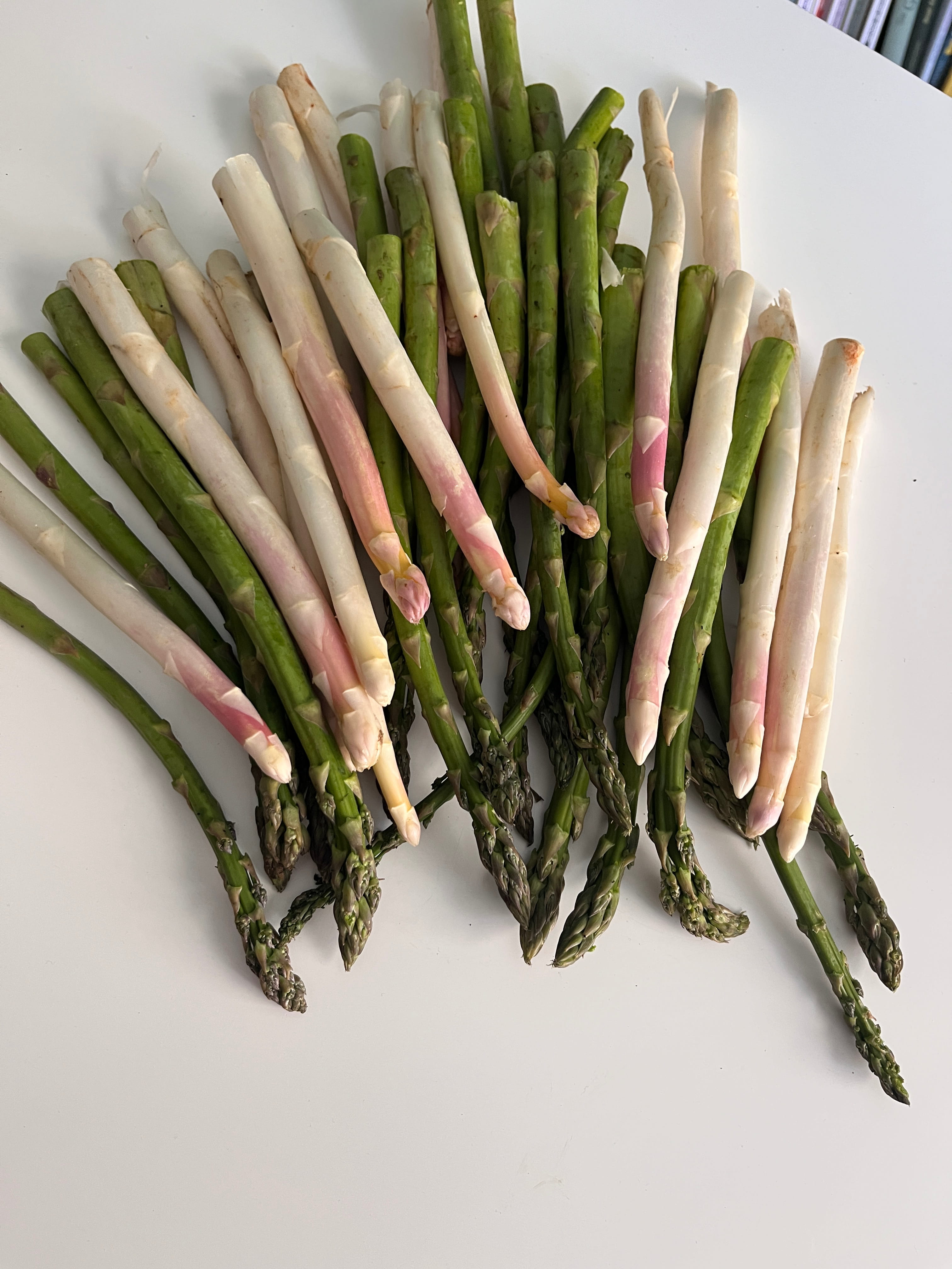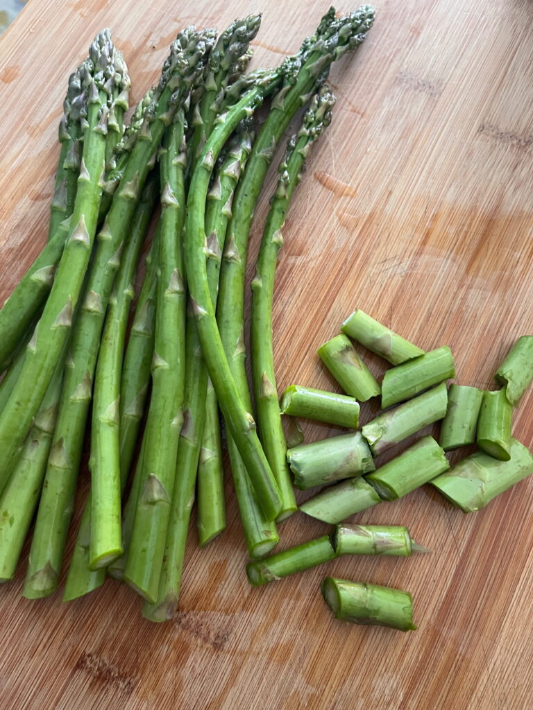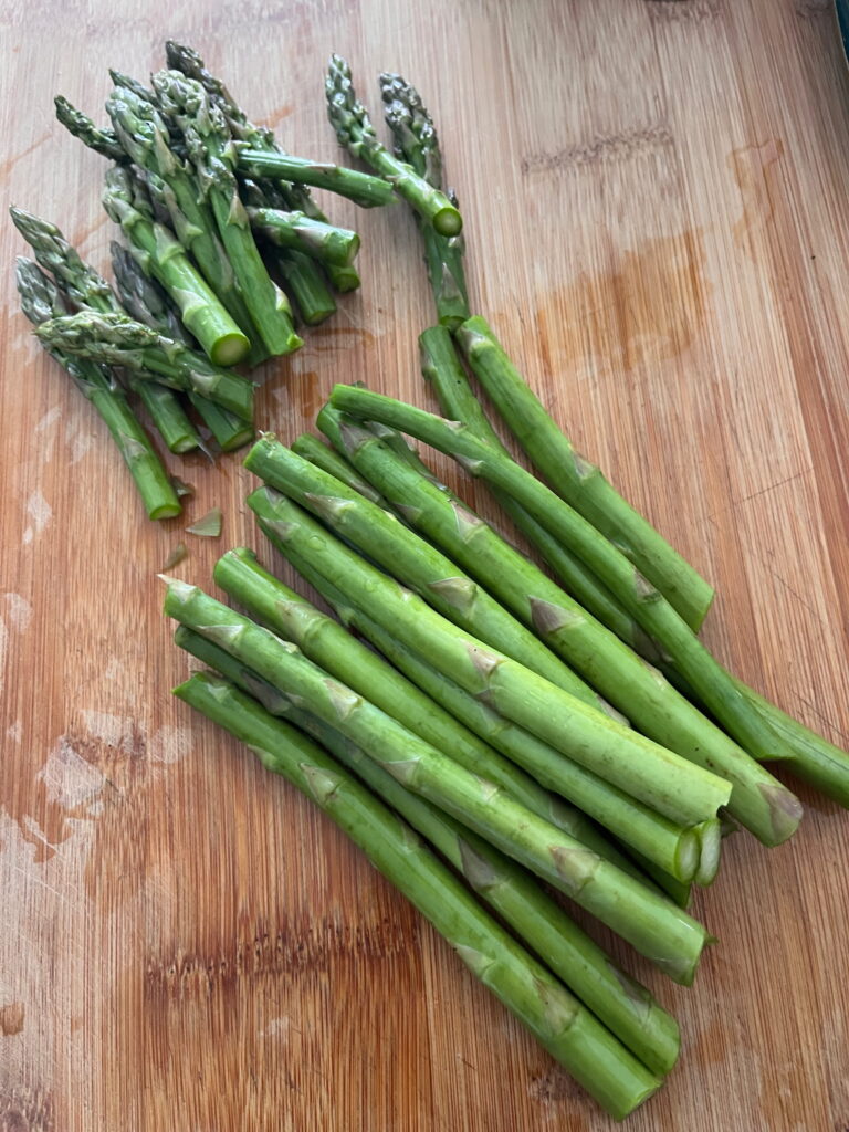 Den Spargel waschen, die unteren Enden, die etwas holzig sein können, abschneiden und entsorgen.