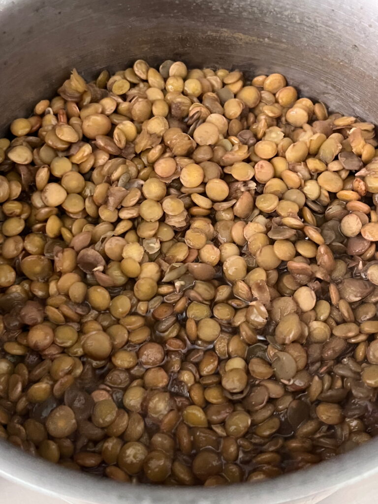 Die Linsen in Salzwasser kochen, bis sie weich, aber nicht matschig sind; das dauert ca. 20 – 25 Minuten.