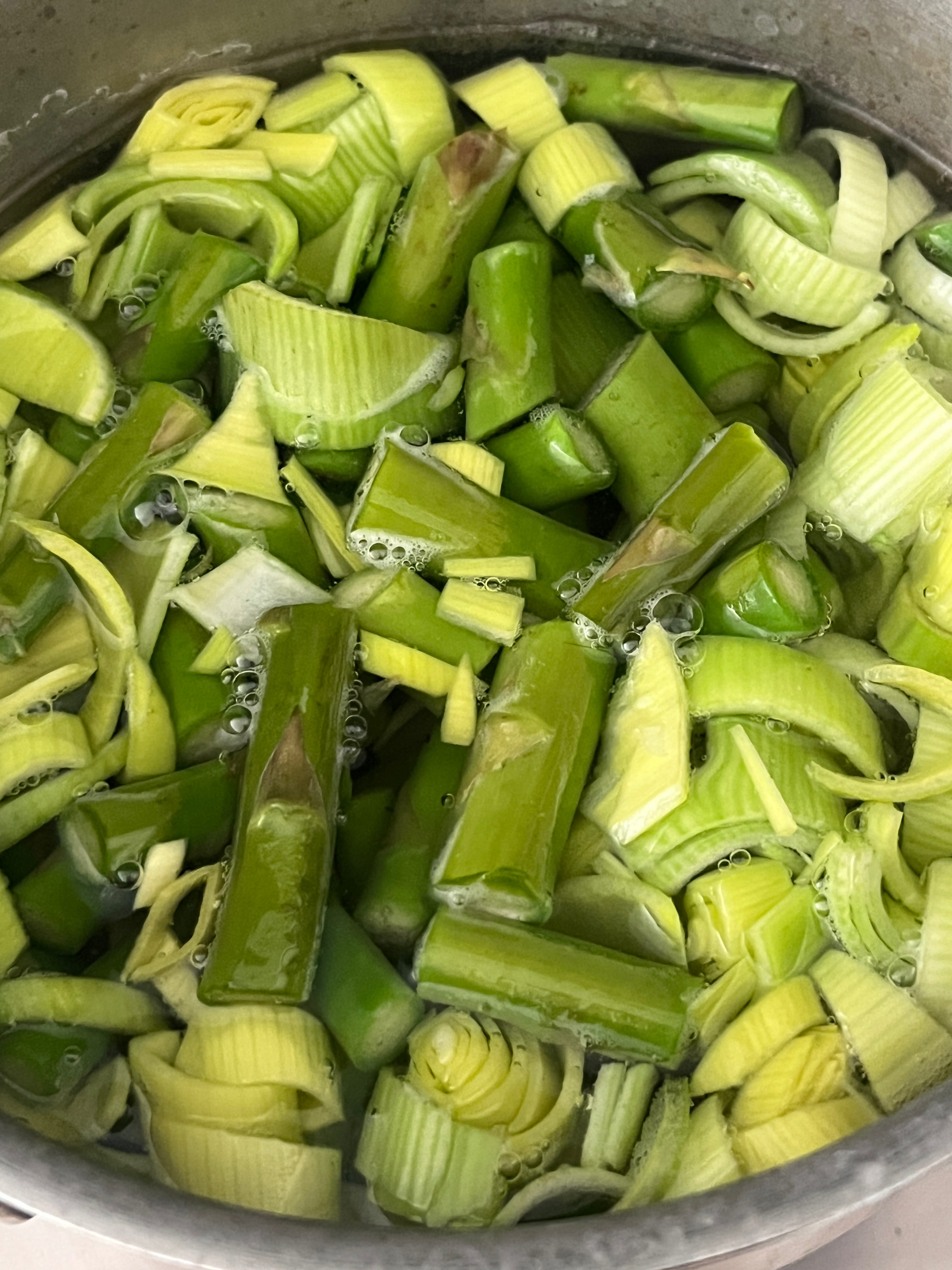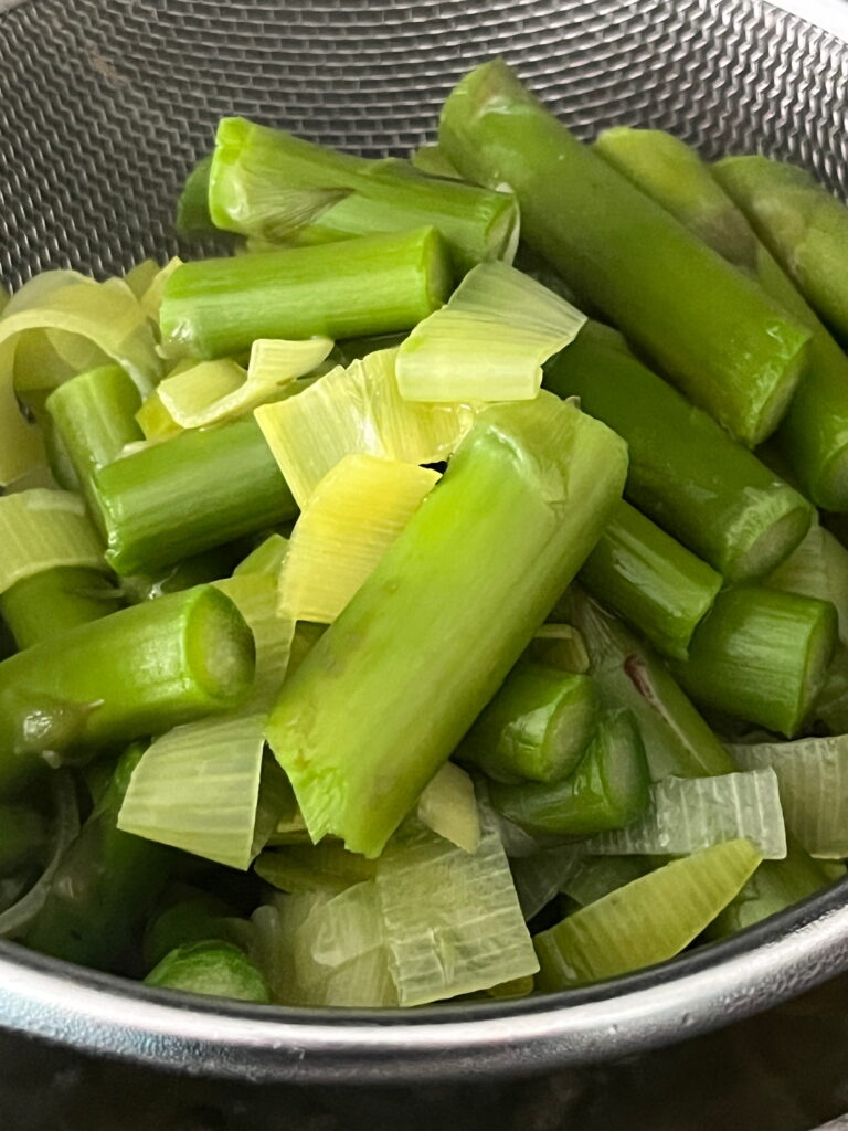 Den Rest des Spargels in kleinere Stücke schneiden, ebenso den Lauch. Gemeinsam in etwas Salzwasser kochen, bis der Spargel weich ist. Das Gemüse mit einem Stabmixer pürieren und 1 EL Butter dazurühren.