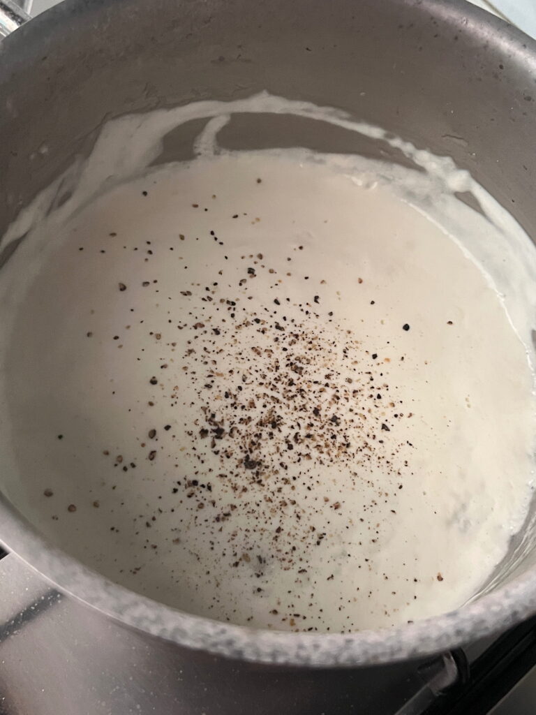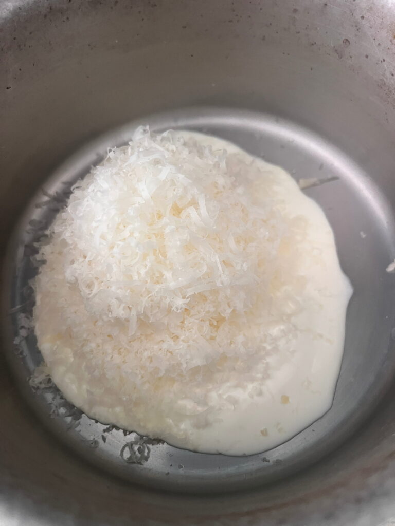 Für die Parmesancreme das Schlagobers erwärmen, den fein geriebenen Parmesan dazurühren – es soll eine cremige Konsistenz entstehen, pfeffern.
