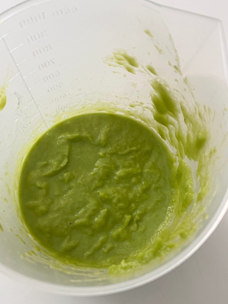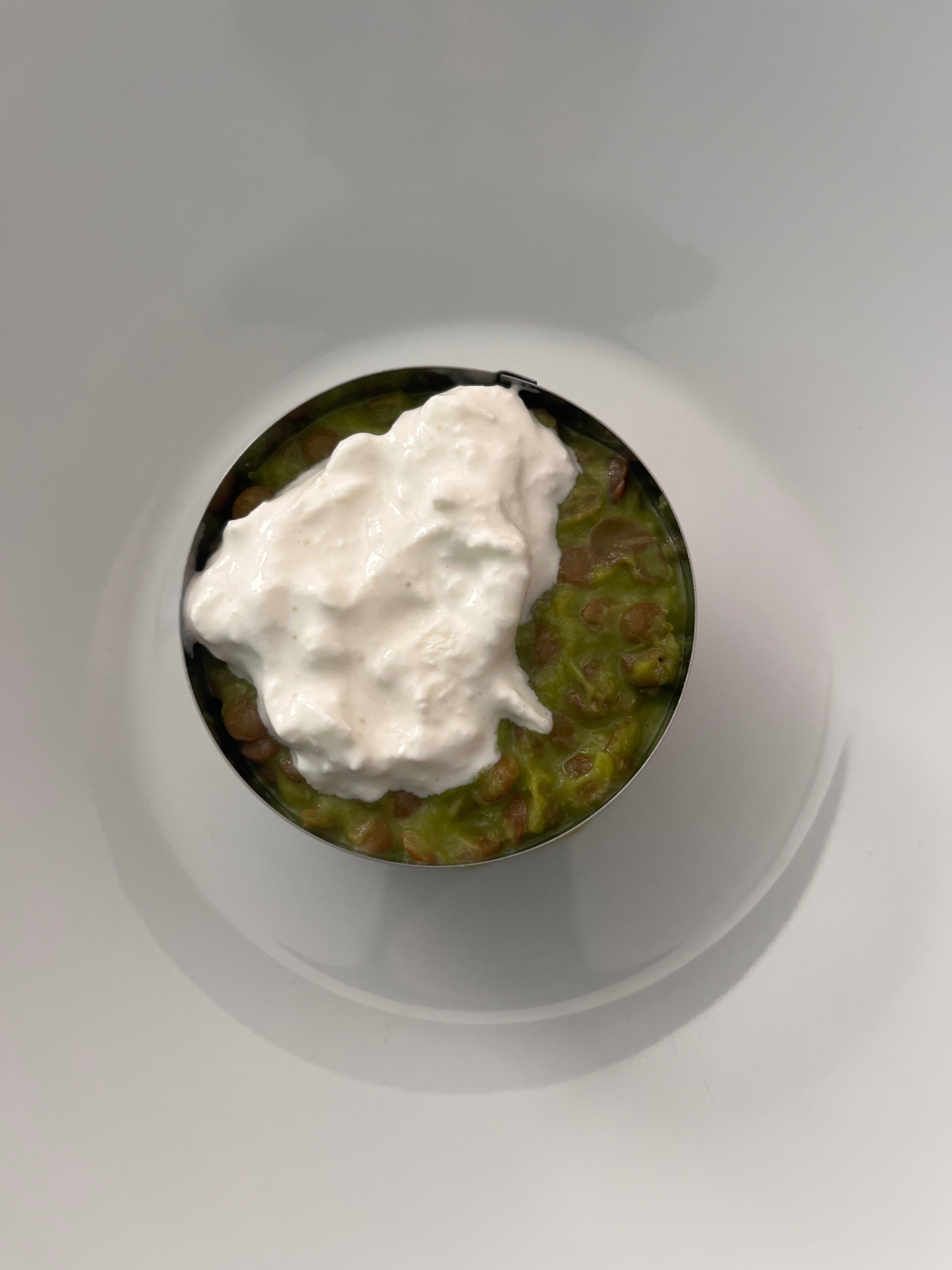 1)Mit Hilfe eines Löffels fülle ich die Linsen-Spargelcreme in die Servierringe, drücke mit dem Löffel die Oberfläche glatt.