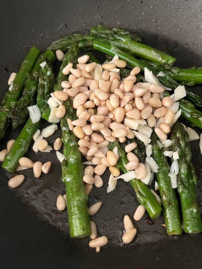 Spargelspitzen und der Butter auf den Herd stellen und einige Minuten braten. Dann den Knoblauch und die Pinienkerne dazugeben und mitbraten, aber aufpassen, dass sie nicht zu dunkel werden!