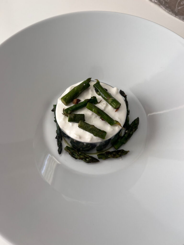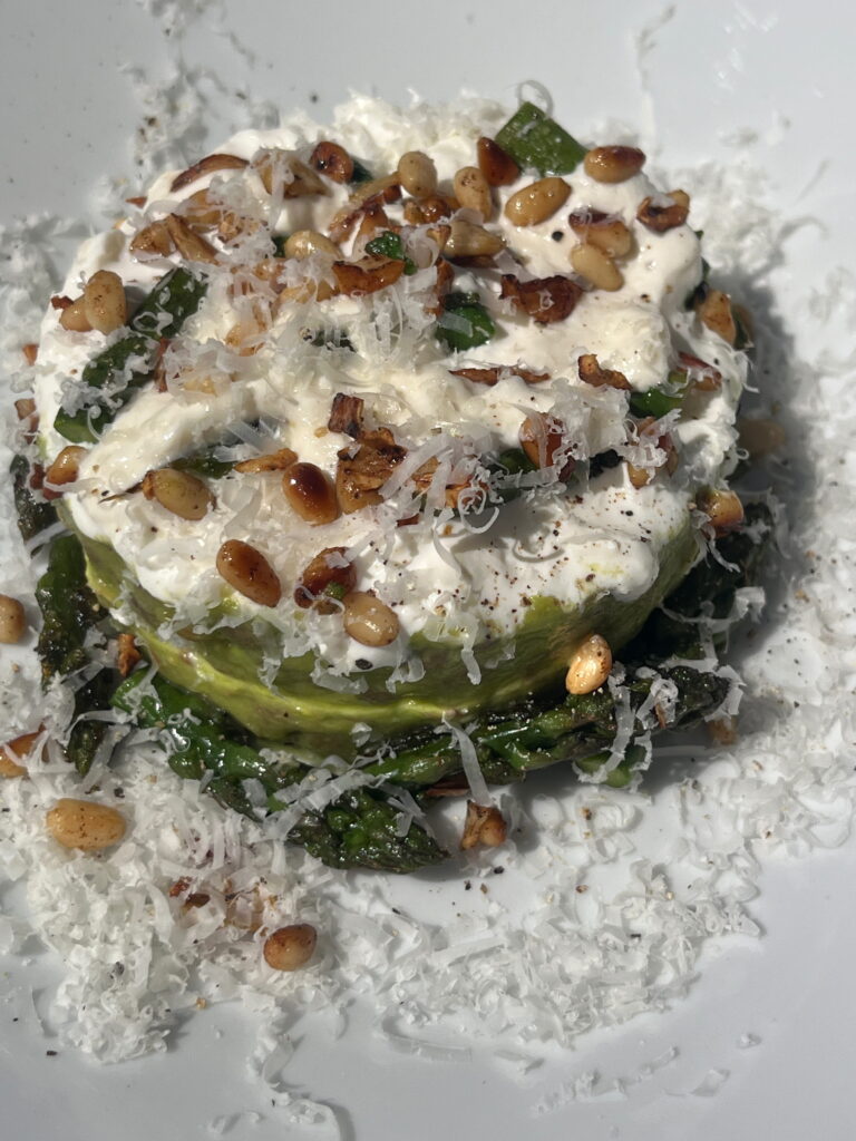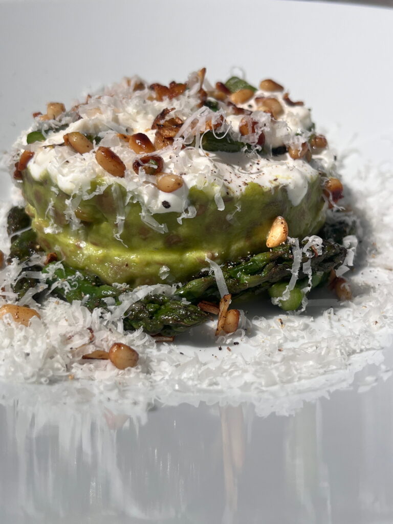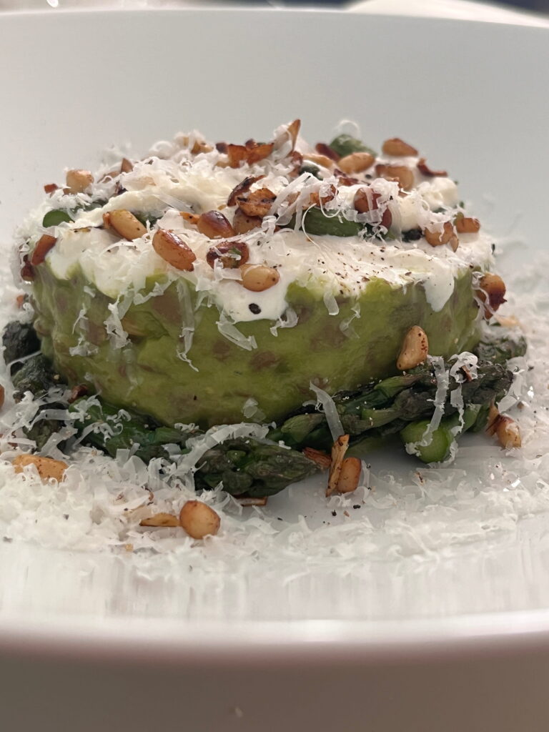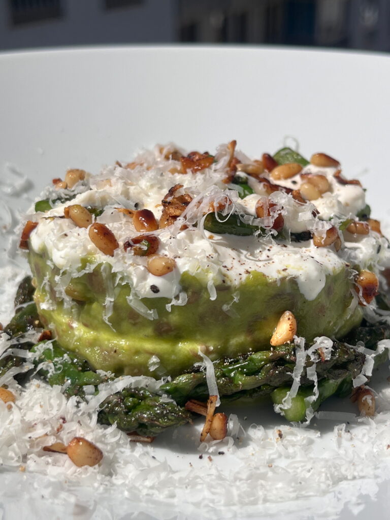 Die Zubereitungsart ist beim Einkaufen im Lebensmittelgeschäft entstanden, und ich finde die Kombination aus den noch etwas knackigen Linsen, dem Spargel und den diversen Cremen sehr interessant.