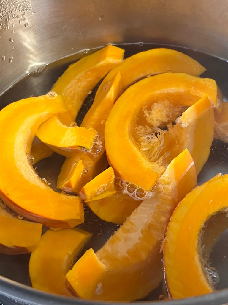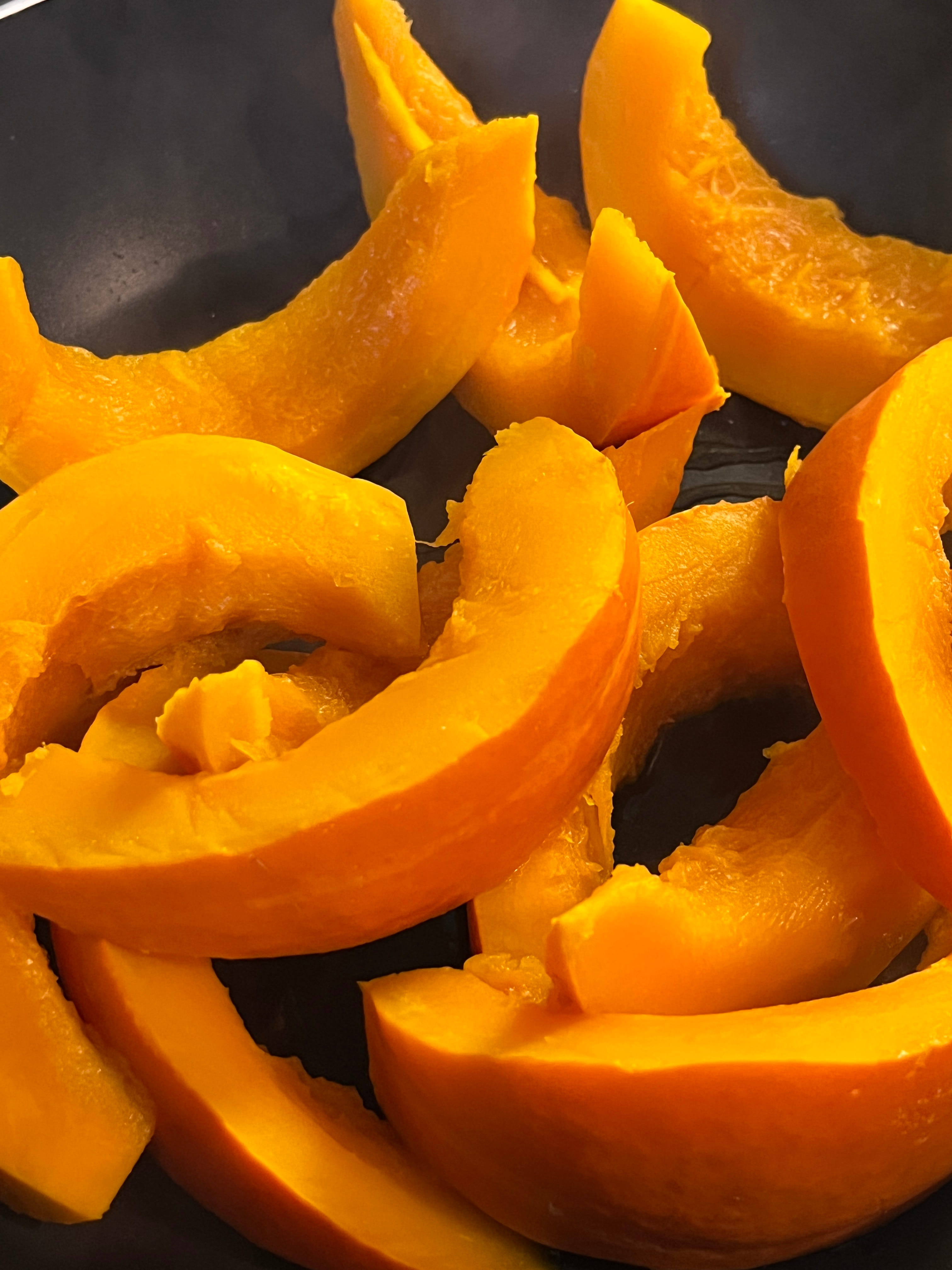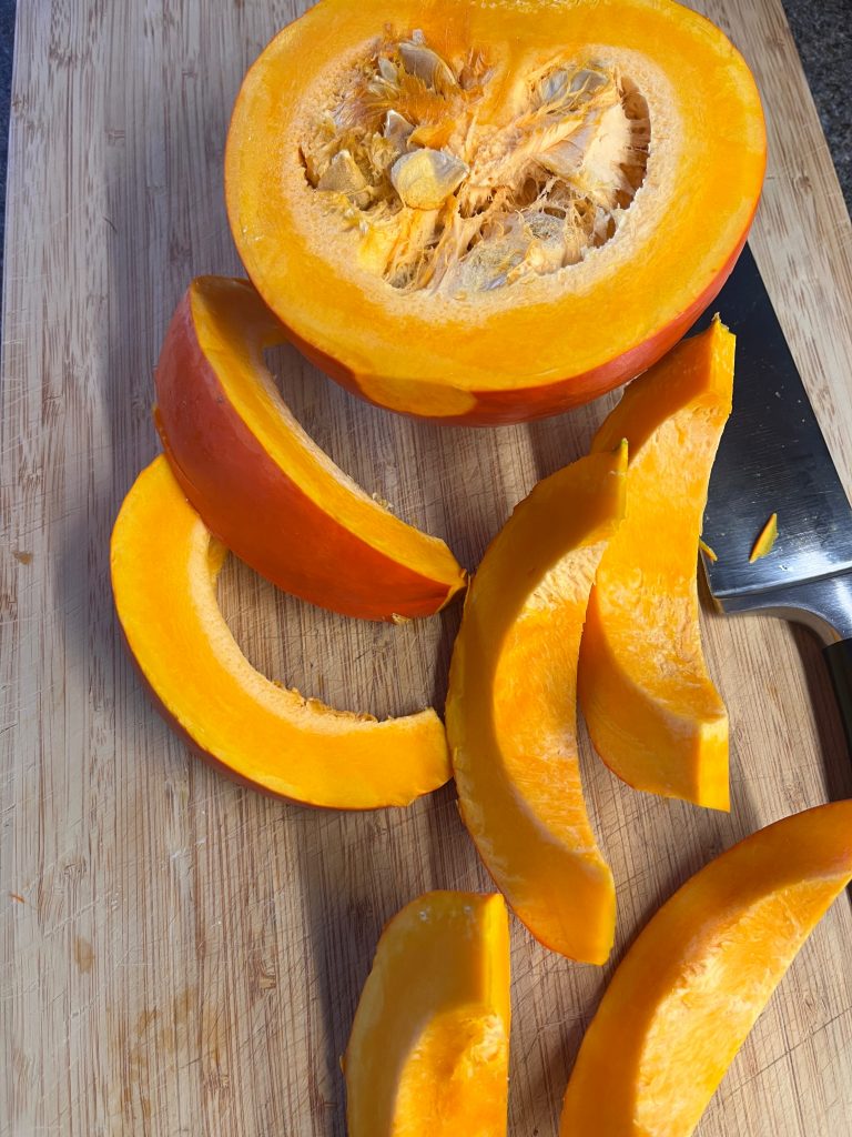 Den Hokkaido ebenfalls waschen abtrocknen, halbieren, entkernen und in Spalten schneiden.