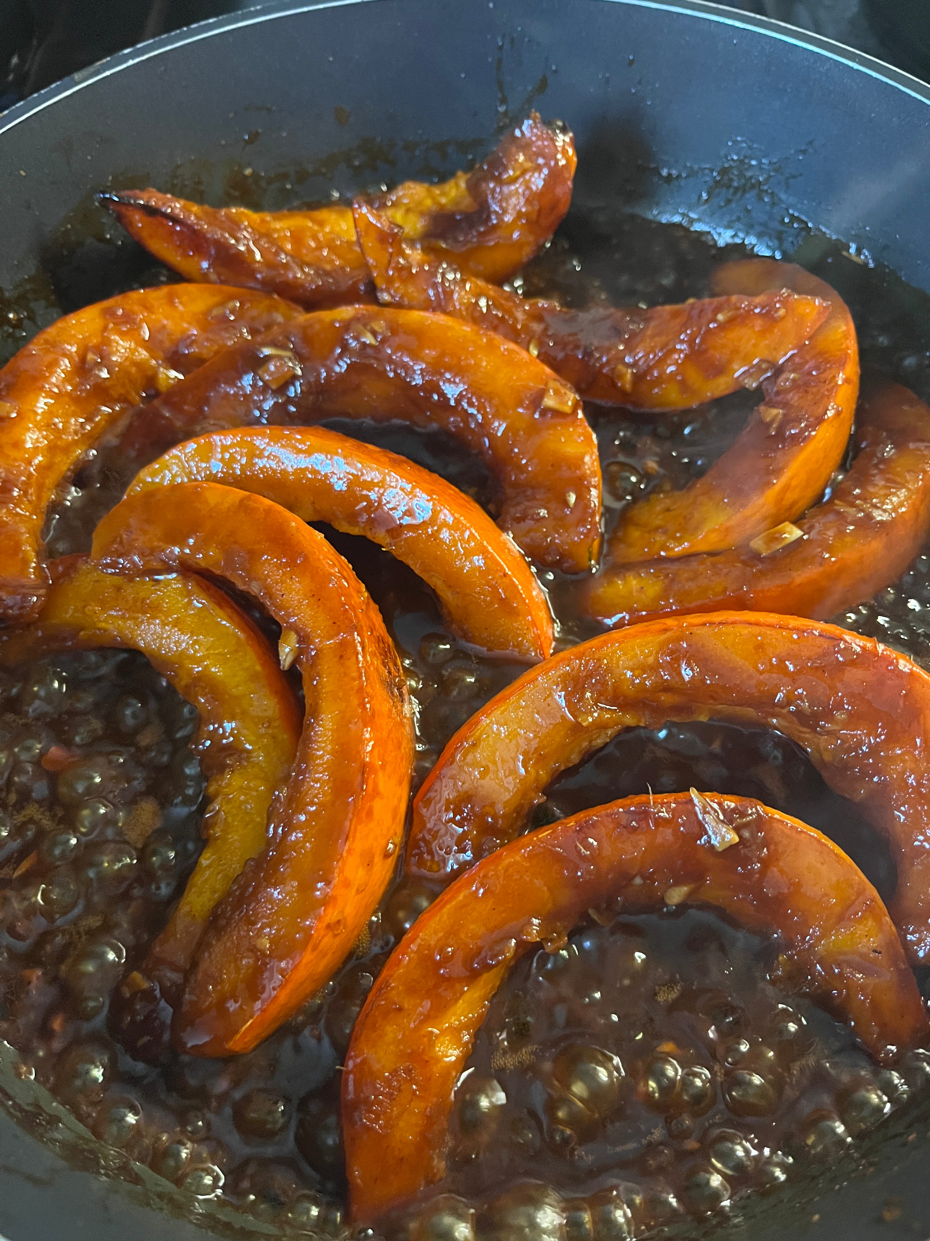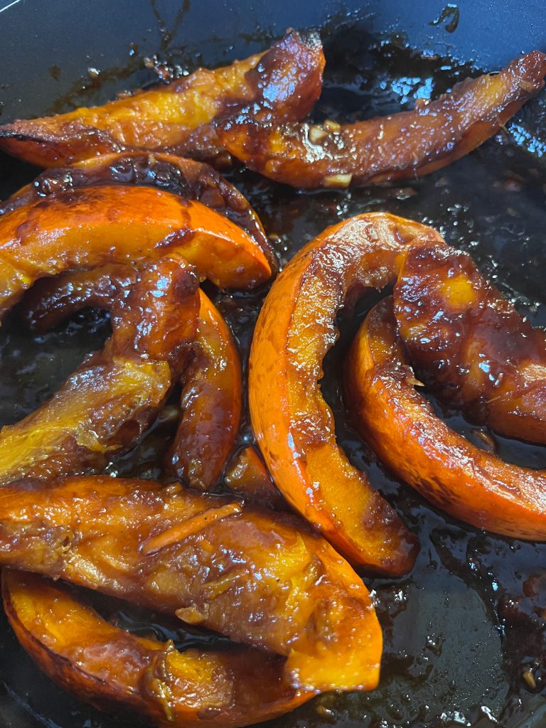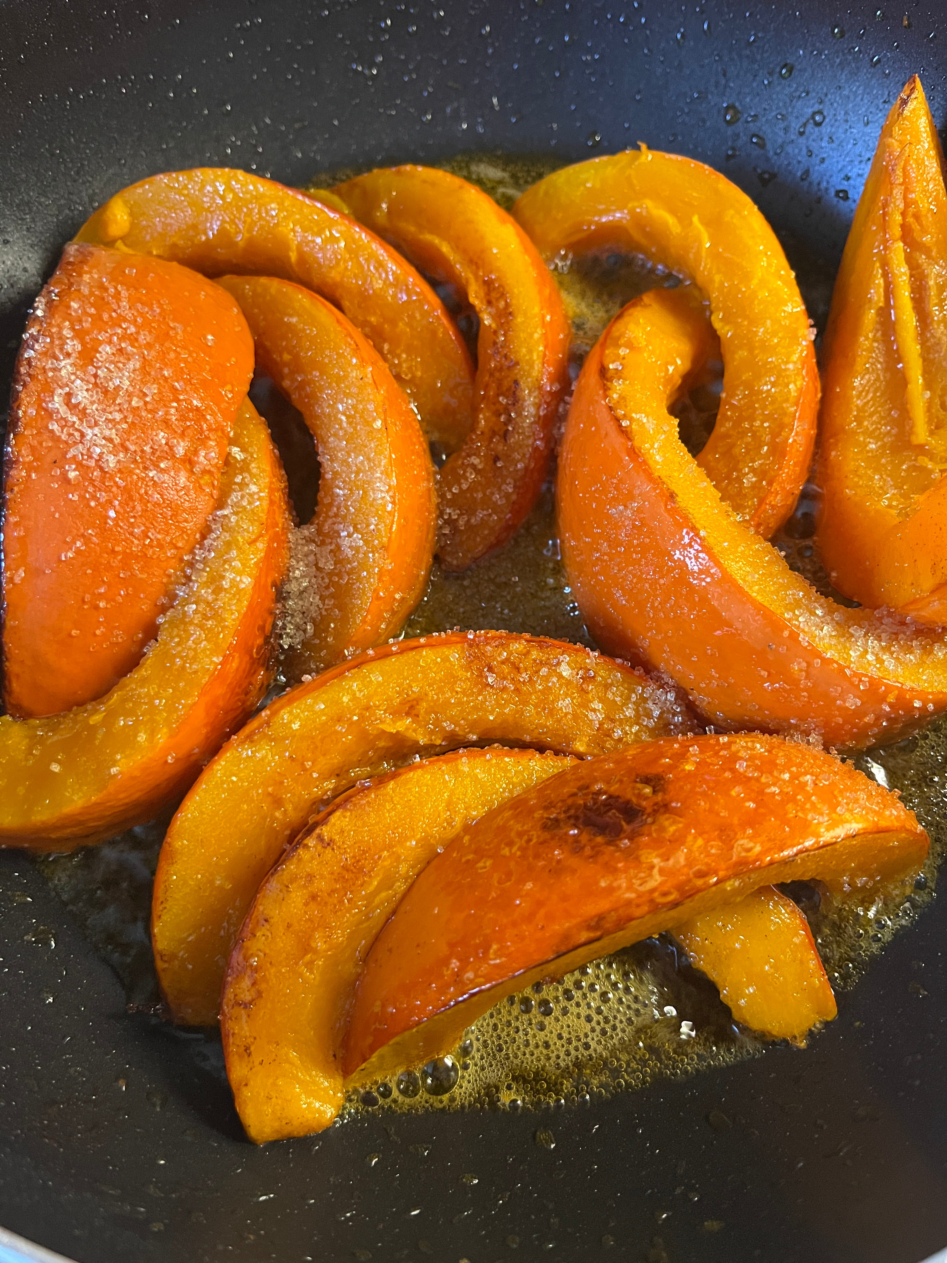 Die Kürbisstücke in diese Pfanne umleeren, eventuelles Fett kann gerne dazu 🙂