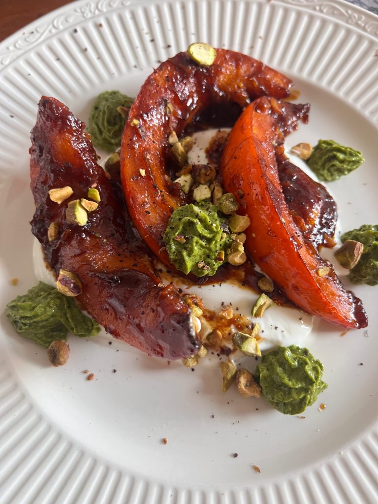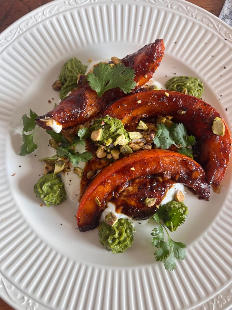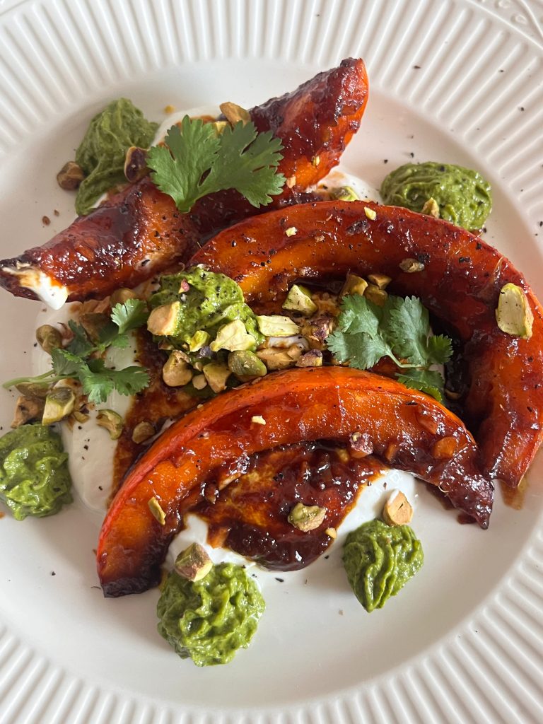 In der Zwischenzeit bereite ich die Teller vor! Jeder von ihnen bekommt einen großen Klecks Skyr! Wenn der Kürbis bissfest geworden ist, die Stücke auf dem Skyr verteilen. Oben auf kommen die gehackten Pistazien und die Korianderblätter. Das Pesto spritze ich mit Hilfe eines Spritzbeutels auf die Teller und fertig ist dieses Geschmackserlebnis!